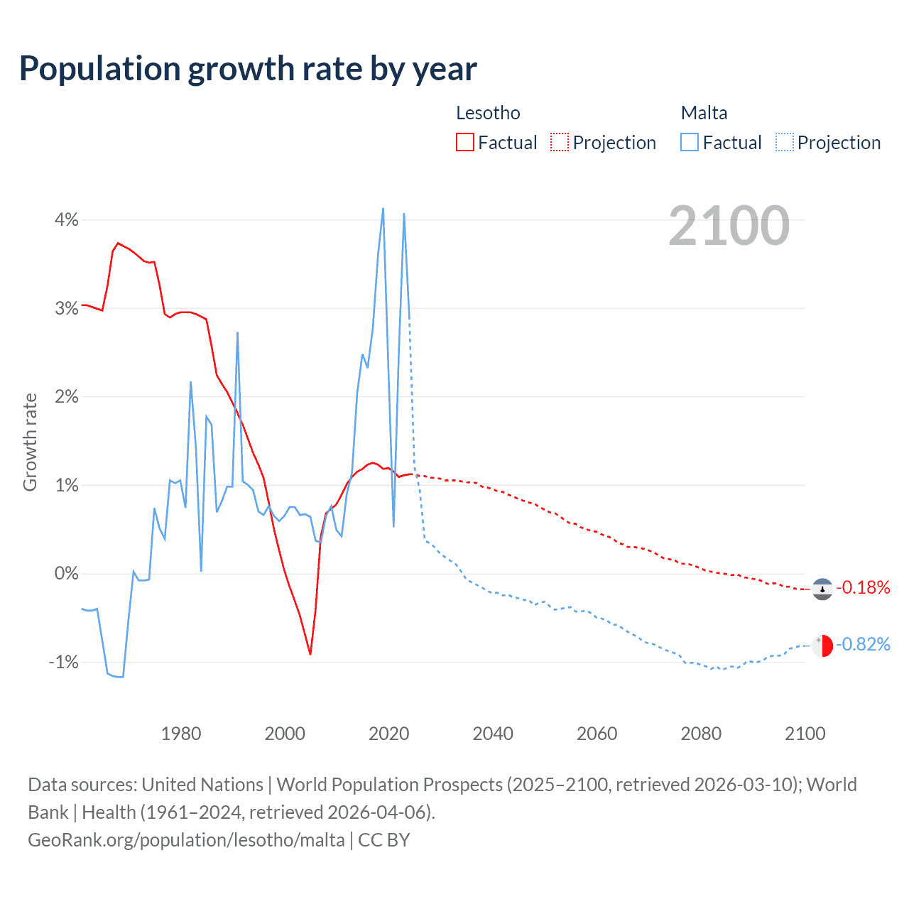 - For the last 10 years, Lesotho has had an average growth rate of +1.17% per year vs +2.69% in Malta.