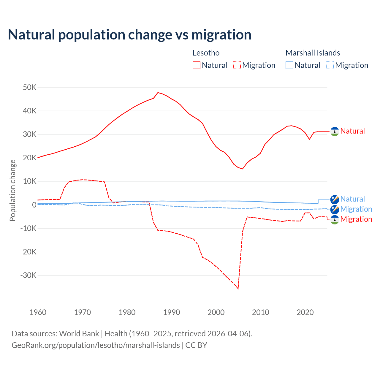 Over the last 10 years, 84.2% of the population change in Lesotho is from natural causes (a gain of 315,836 people) and 15.8% is from migration (a loss of 59,457 people). In the Marshall Islands 27.8% is from natural causes (a gain of 7,592 people) and 72.2% is from migration (a loss of 19,682 people).