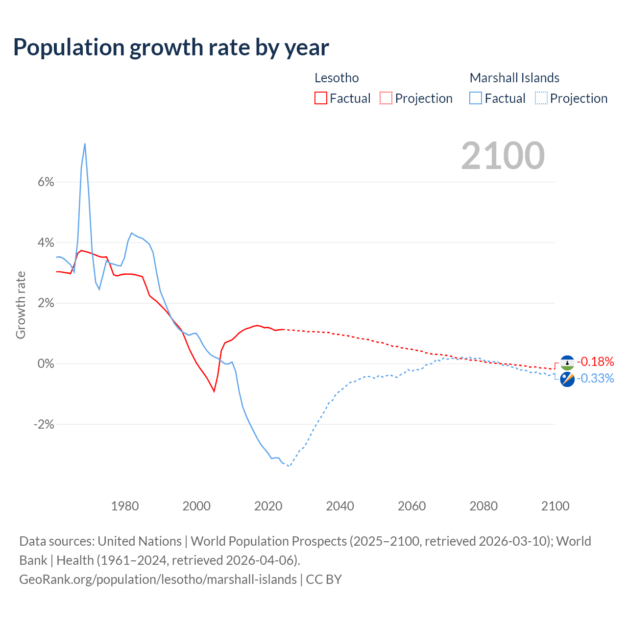 - For the last 10 years, Lesotho has had an average growth rate of +1.17% per year vs -2.69% in the Marshall Islands.