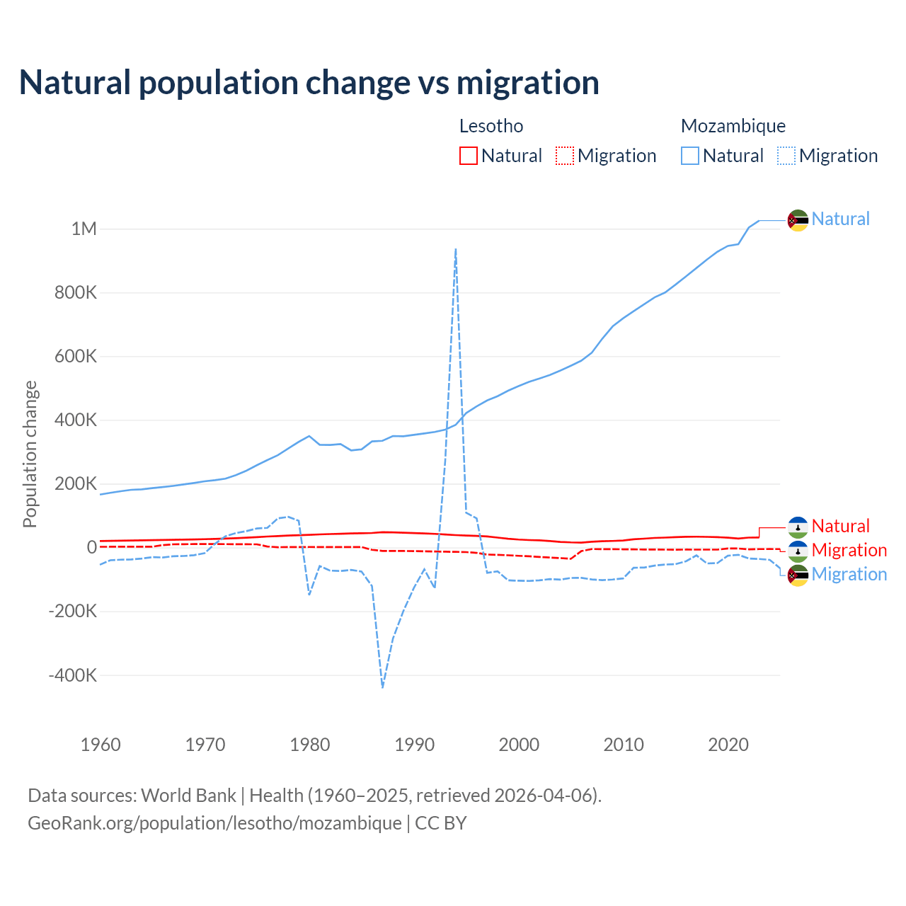 Over the last 10 years, 84.2% of the population change in Lesotho is from natural causes (a gain of 315,836 people) and 15.8% is from migration (a loss of 59,457 people). In Mozambique 95.9% is from natural causes (a gain of 9,108,203 people) and 4.15% is from migration (a loss of 393,923 people).