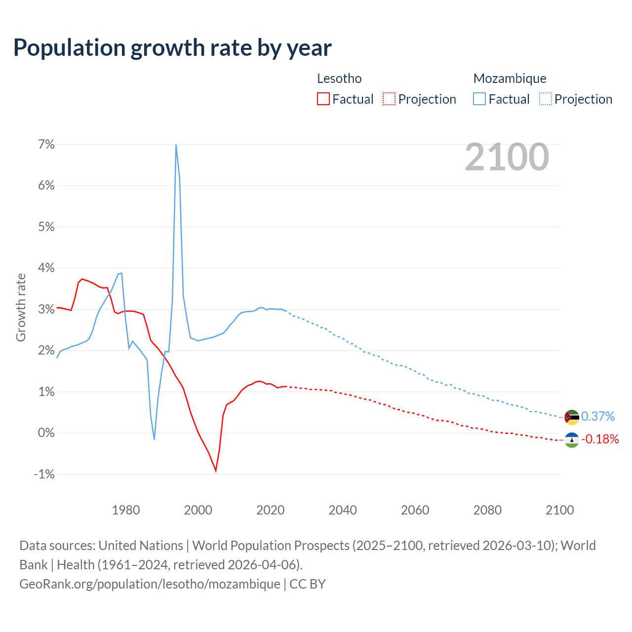 - For the last 10 years, Lesotho has had an average growth rate of +1.17% per year vs +2.99% in Mozambique.