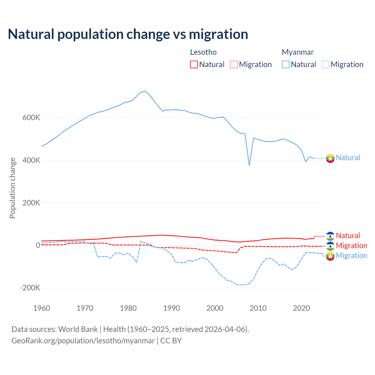 Over the last 10 years, 84.2% of the population change in Lesotho is from natural causes (a gain of 315,836 people) and 15.8% is from migration (a loss of 59,457 people). In Myanmar 86% is from natural causes (a gain of 4,594,615 people) and 14% is from migration (a loss of 749,272 people).