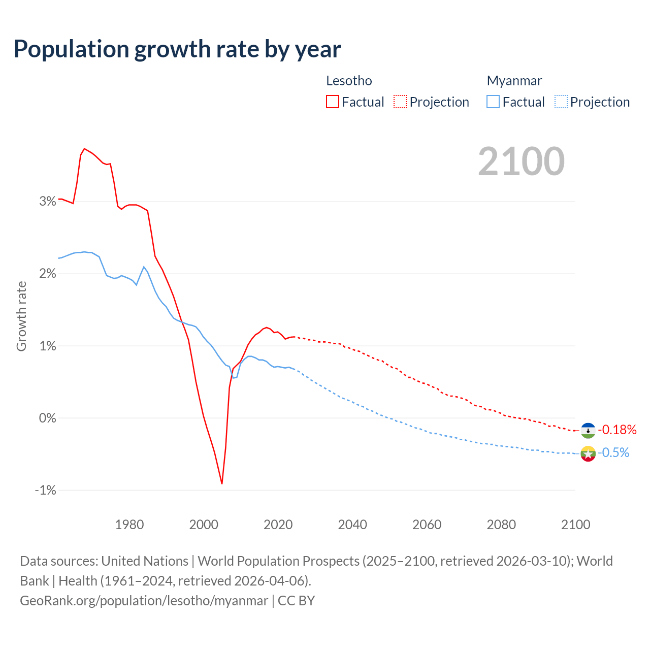 - For the last 10 years, Lesotho has had an average growth rate of +1.17% per year vs +0.74% in Myanmar.