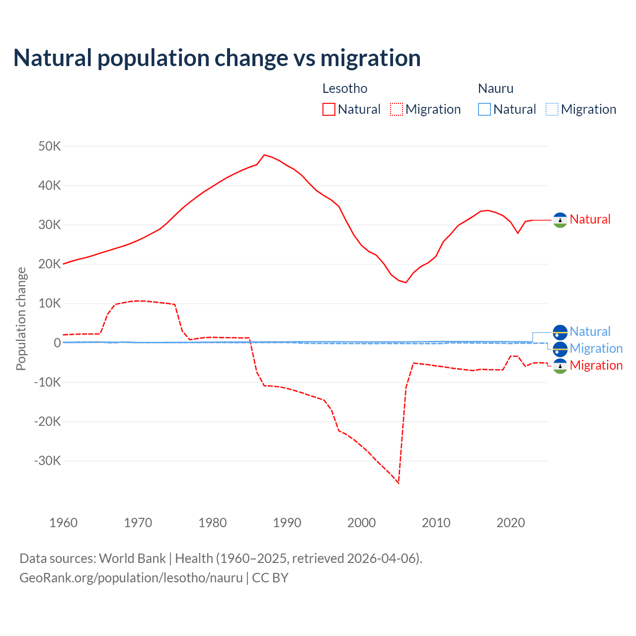 Over the last 10 years, 84.2% of the population change in Lesotho is from natural causes (a gain of 315,836 people) and 15.8% is from migration (a loss of 59,457 people). In Nauru 66.2% is from natural causes (a gain of 2,590 people) and 33.8% is from migration (a loss of 1,320 people).