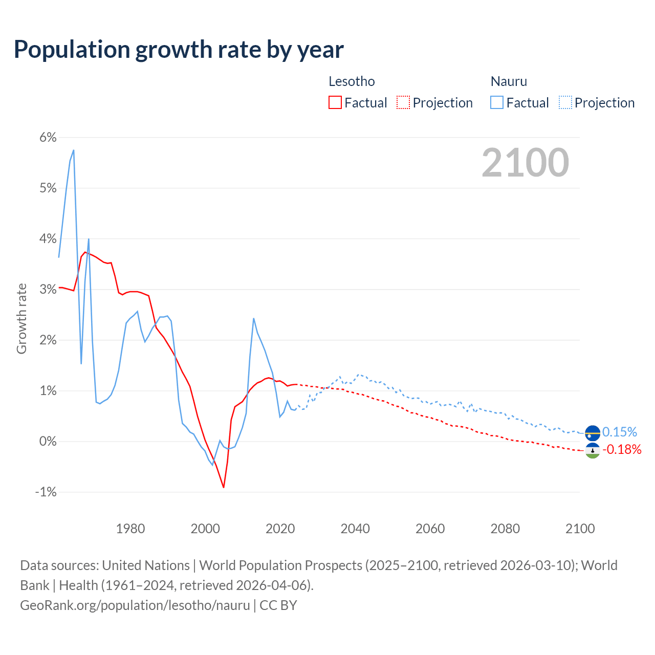 - For the last 10 years, Lesotho has had an average growth rate of +1.17% per year vs +1.17% in Nauru.