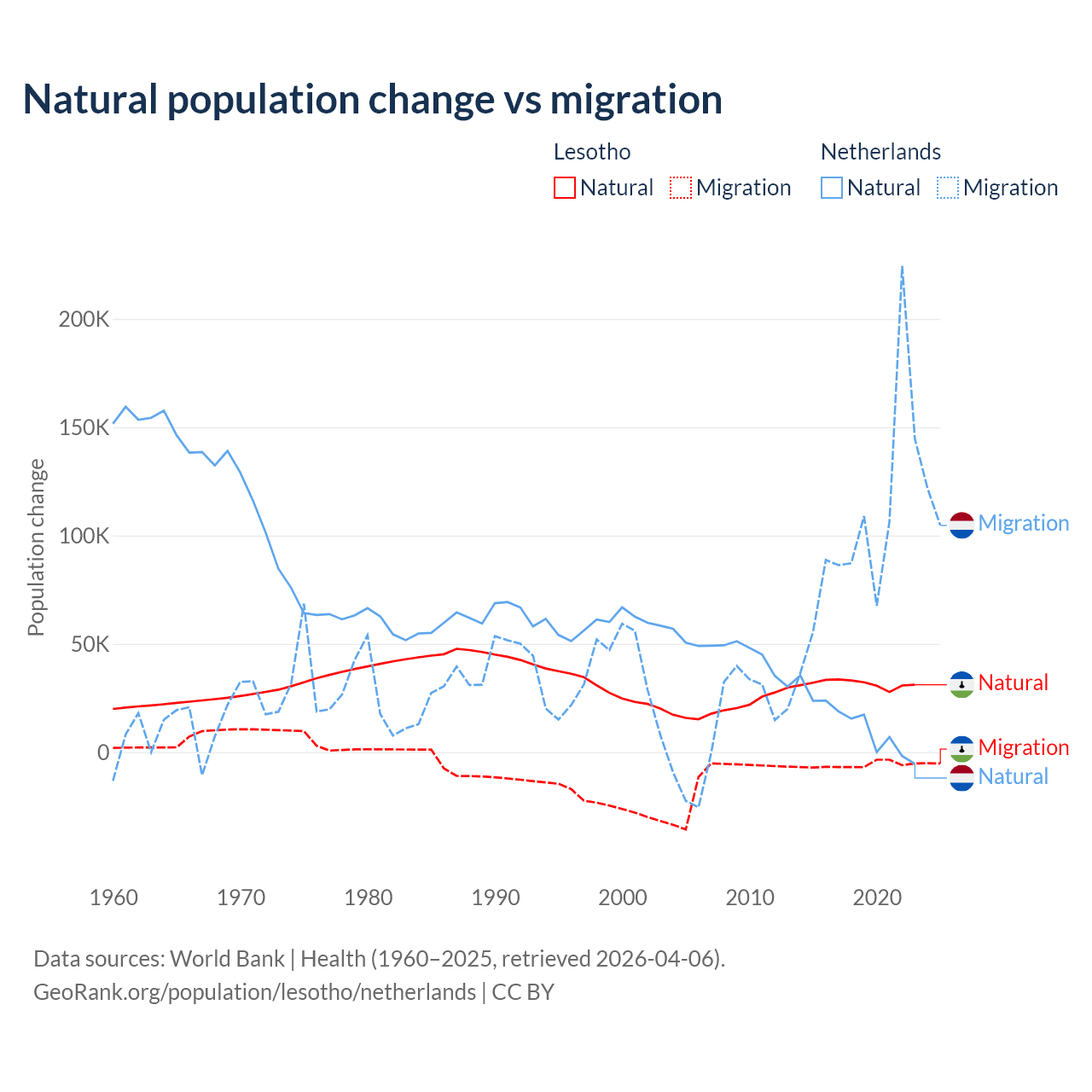 Over the last 10 years, 84.2% of the population change in Lesotho is from natural causes (a gain of 315,836 people) and 15.8% is from migration (a loss of 59,457 people). In the Netherlands 11.8% is from natural causes (a gain of 134,554 people) and 88.2% is from migration (a gain of 1,006,495 people).