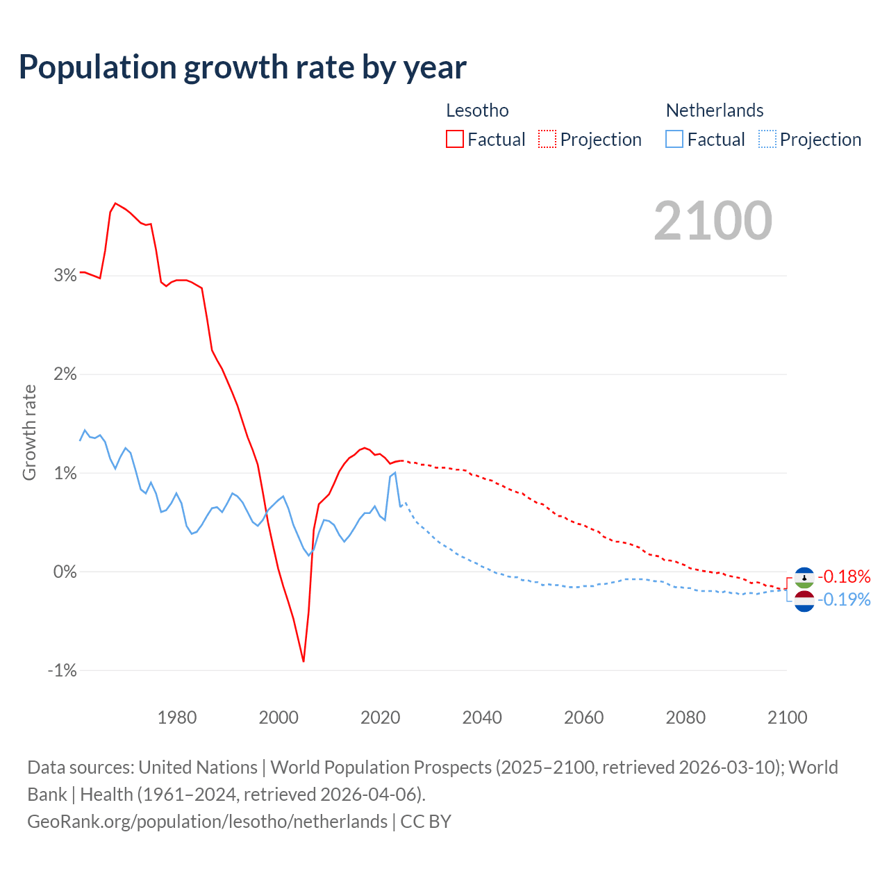 - For the last 10 years, Lesotho has had an average growth rate of +1.17% per year vs +0.62% in the Netherlands.