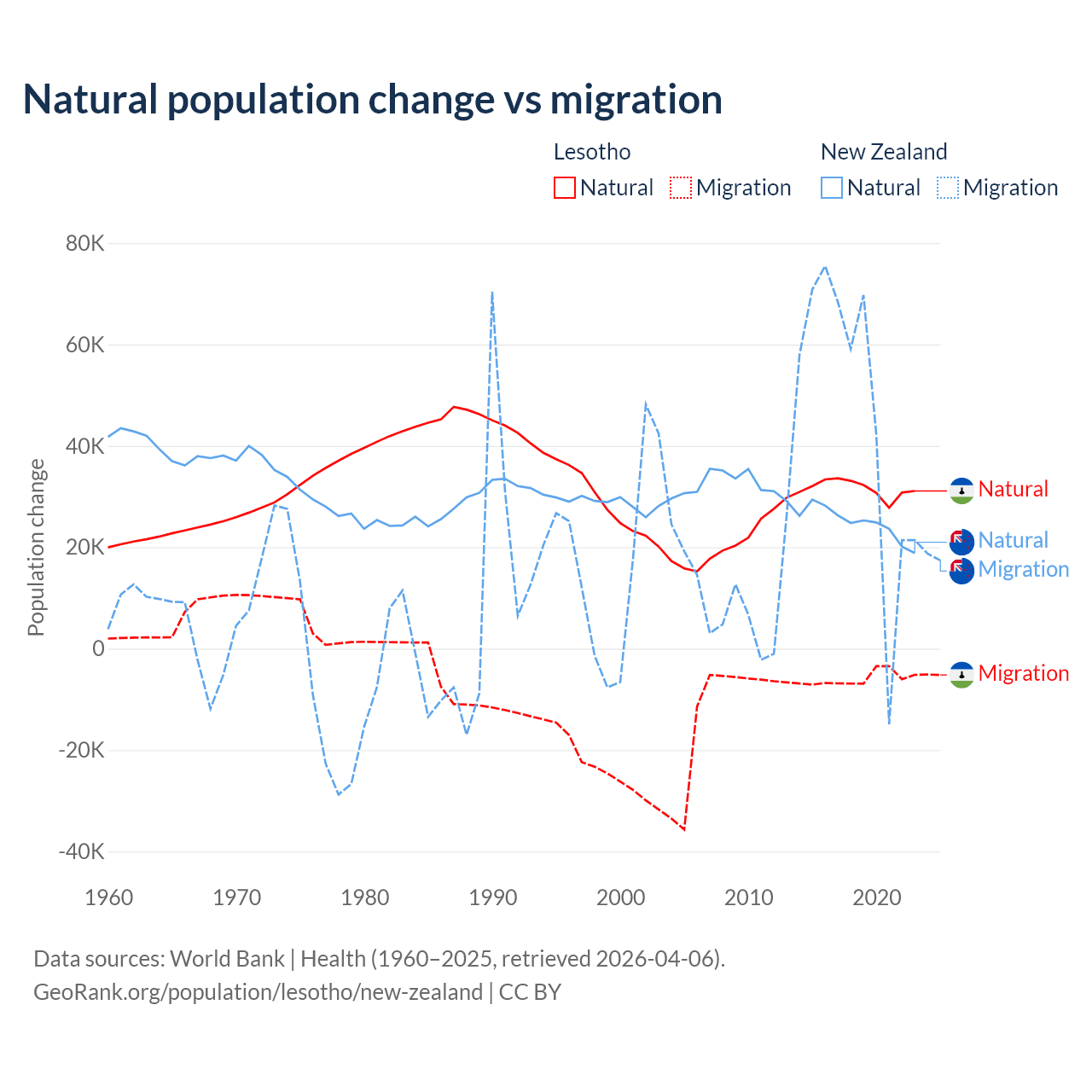 Over the last 10 years, 84.2% of the population change in Lesotho is from natural causes (a gain of 315,836 people) and 15.8% is from migration (a loss of 59,457 people). In New Zealand 34.4% is from natural causes (a gain of 247,767 people) and 65.6% is from migration (a gain of 471,602 people).