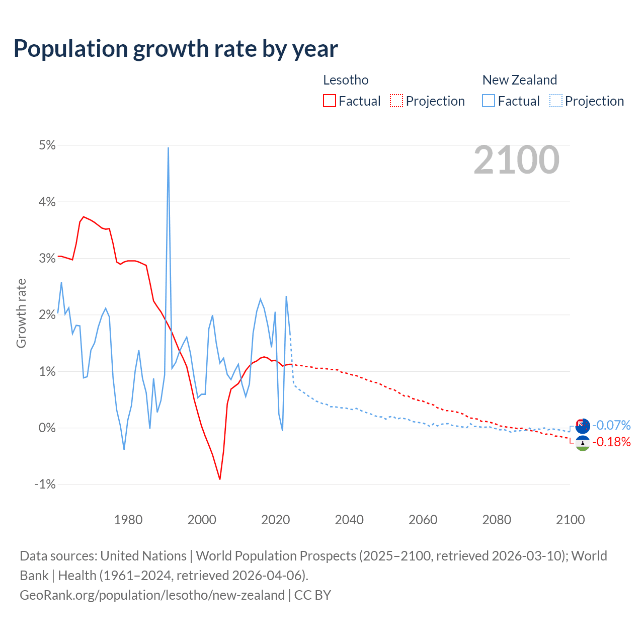 - For the last 10 years, Lesotho has had an average growth rate of +1.17% per year vs +1.6% in New Zealand.