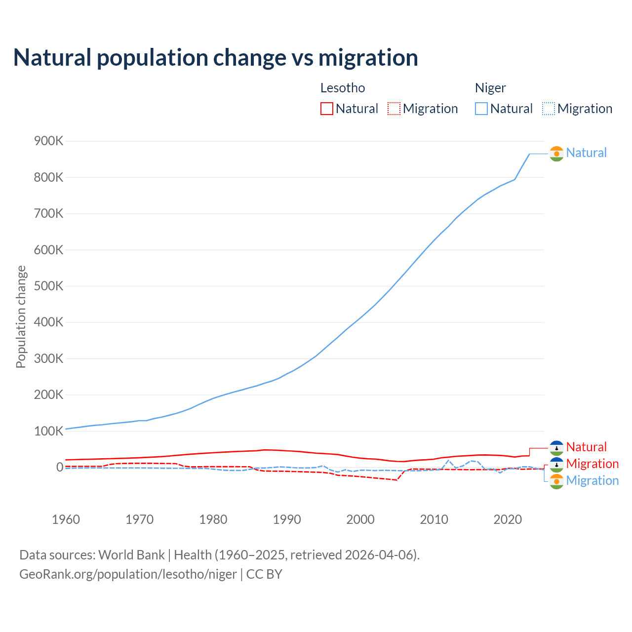 Over the last 10 years, 84.2% of the population change in Lesotho is from natural causes (a gain of 315,836 people) and 15.8% is from migration (a loss of 59,457 people). In Niger 100% is from natural causes (a gain of 7,728,287 people) and 0.03% is from migration (a gain of 2,520 people).