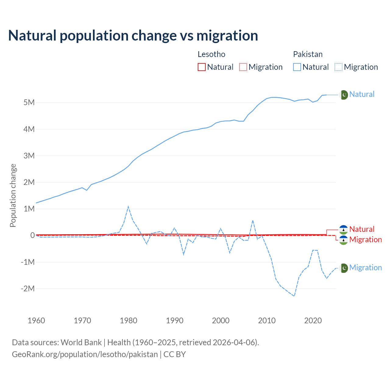 Over the last 10 years, 84.2% of the population change in Lesotho is from natural causes (a gain of 315,836 people) and 15.8% is from migration (a loss of 59,457 people). In Pakistan 77.8% is from natural causes (a gain of 51,255,404 people) and 22.2% is from migration (a loss of 14,629,055 people).