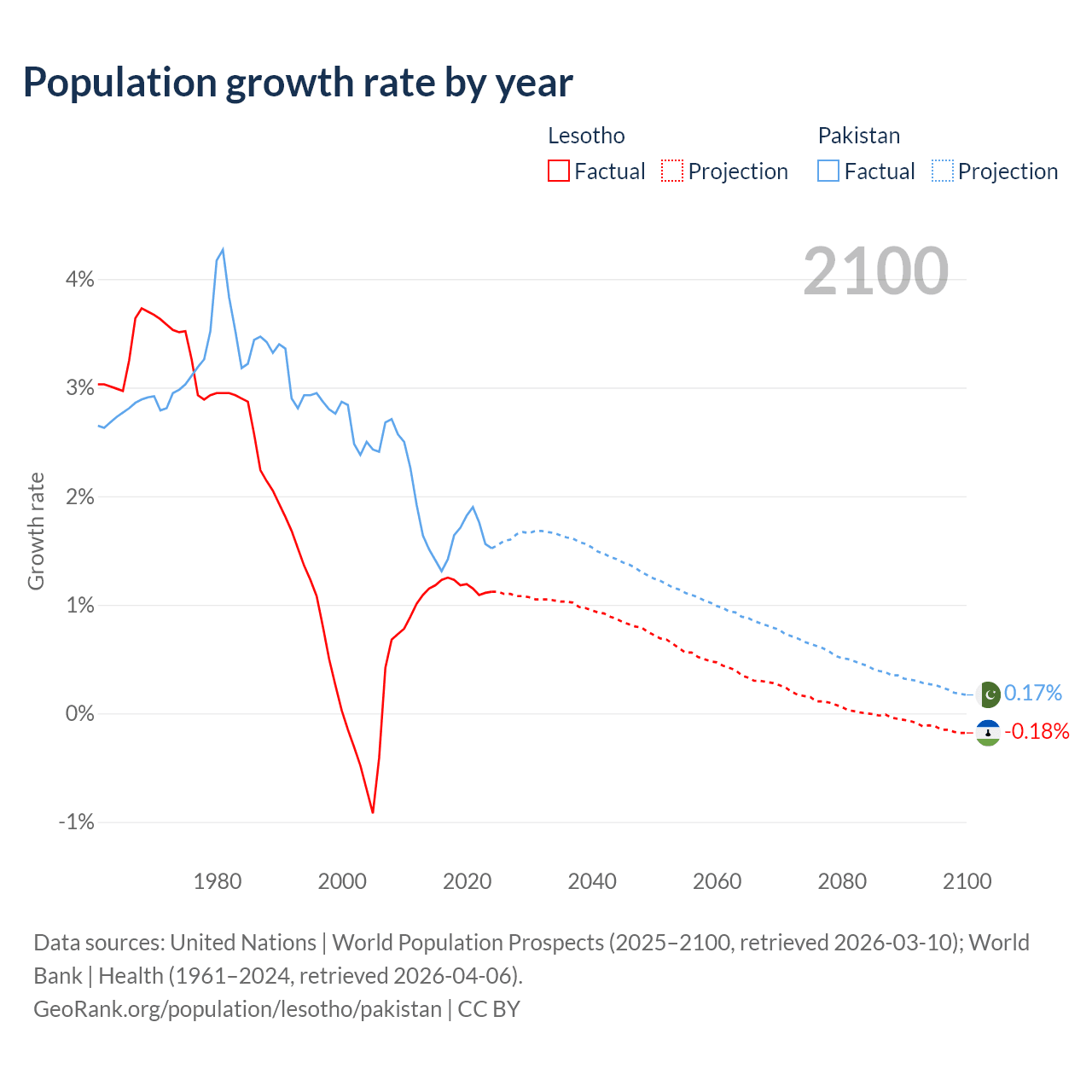 - For the last 10 years, Lesotho has had an average growth rate of +1.17% per year vs +1.6% in Pakistan.