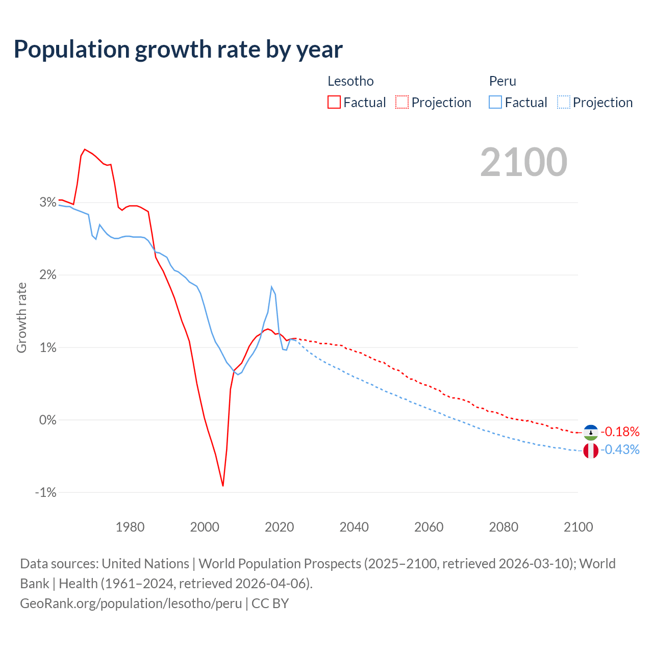 - For the last 10 years, Lesotho has had an average growth rate of +1.17% per year vs +1.26% in Peru.