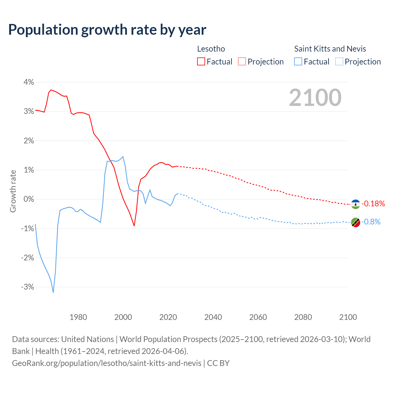 - For the last 10 years, Lesotho has had an average growth rate of +1.17% per year vs -0.04% in Saint Kitts and Nevis.