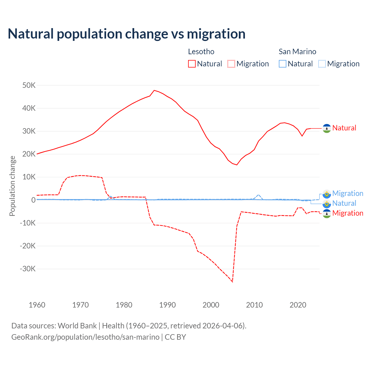 Over the last 10 years, 84.2% of the population change in Lesotho is from natural causes (a gain of 315,836 people) and 15.8% is from migration (a loss of 59,457 people). In San Marino 40.9% is from natural causes (a loss of 358 people) and 59.1% is from migration (a gain of 517 people).