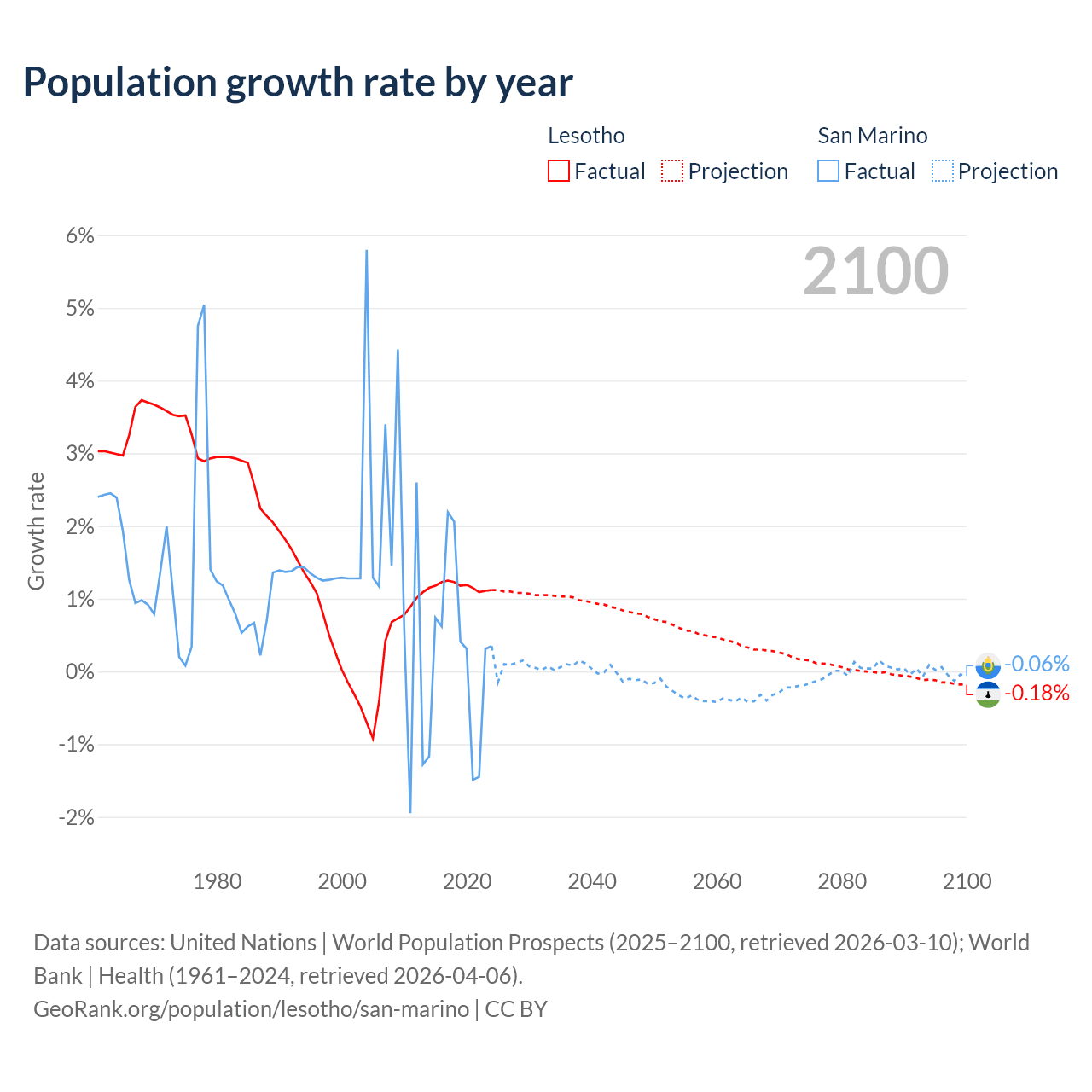 - For the last 10 years, Lesotho has had an average growth rate of +1.17% per year vs +0.26% in San Marino.