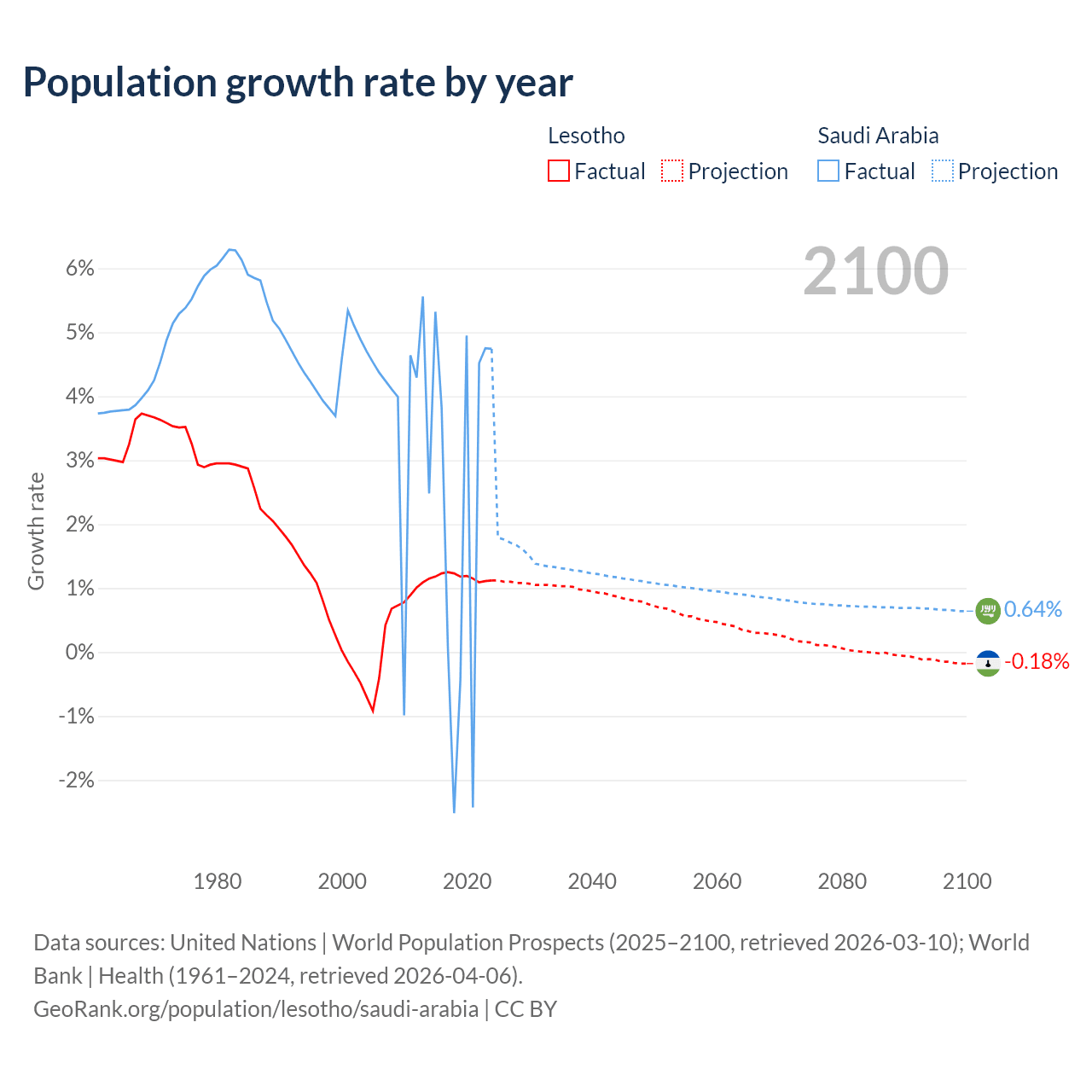 - For the last 10 years, Lesotho has had an average growth rate of +1.17% per year vs +2.3% in Saudi Arabia.
