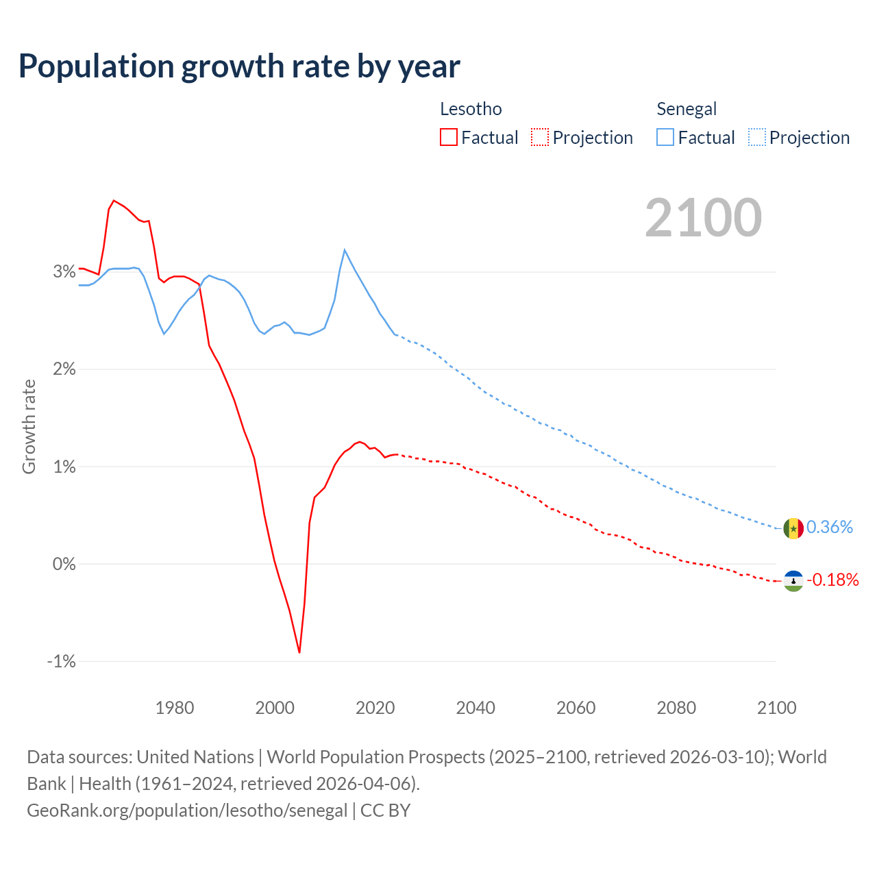 - For the last 10 years, Lesotho has had an average growth rate of +1.17% per year vs +2.76% in Senegal.