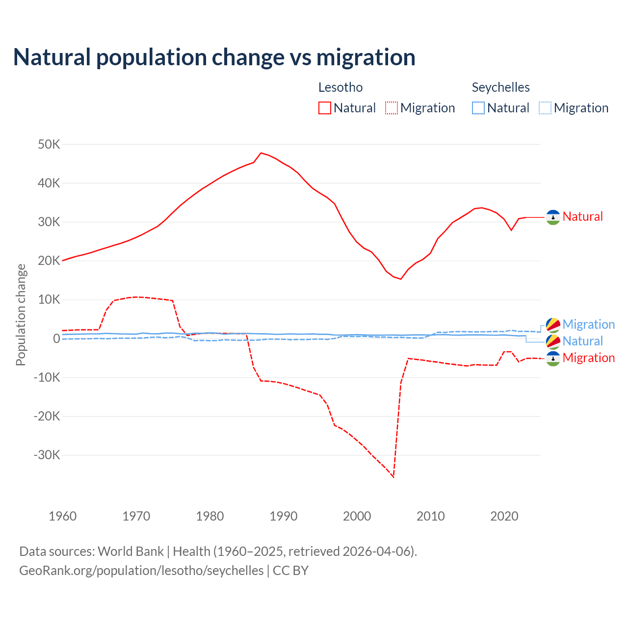 Over the last 10 years, 84.2% of the population change in Lesotho is from natural causes (a gain of 315,836 people) and 15.8% is from migration (a loss of 59,457 people). In the Seychelles 31.4% is from natural causes (a gain of 8,122 people) and 68.6% is from migration (a gain of 17,748 people).