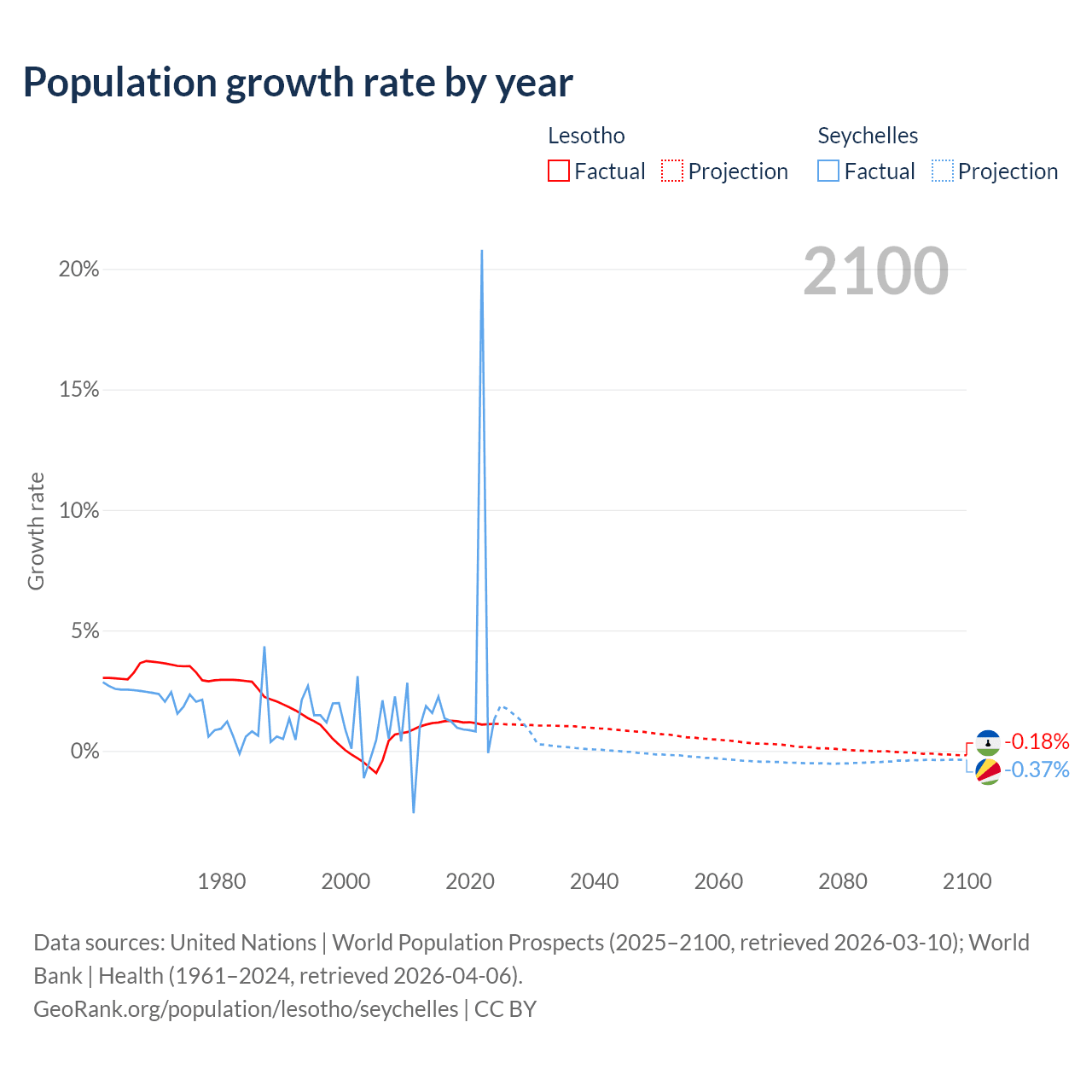 - For the last 10 years, Lesotho has had an average growth rate of +1.17% per year vs +2.9% in the Seychelles.