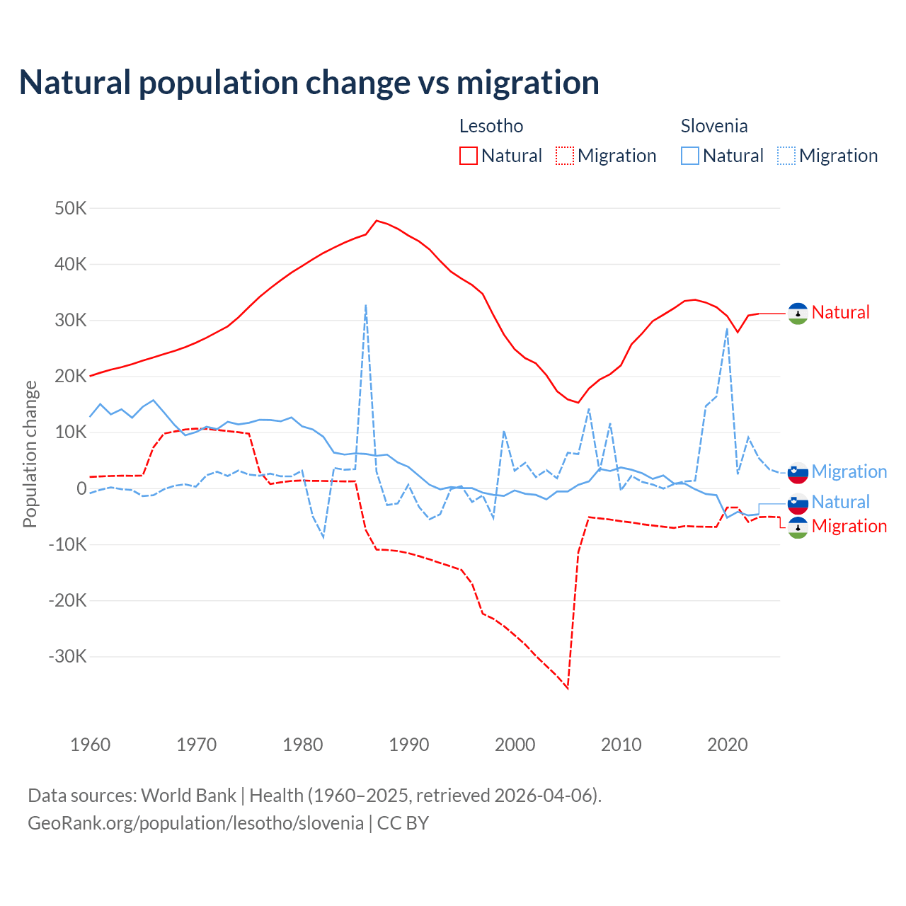 Over the last 10 years, 84.2% of the population change in Lesotho is from natural causes (a gain of 315,836 people) and 15.8% is from migration (a loss of 59,457 people). In Slovenia 18.1% is from natural causes (a loss of 17,573 people) and 81.9% is from migration (a gain of 79,532 people).