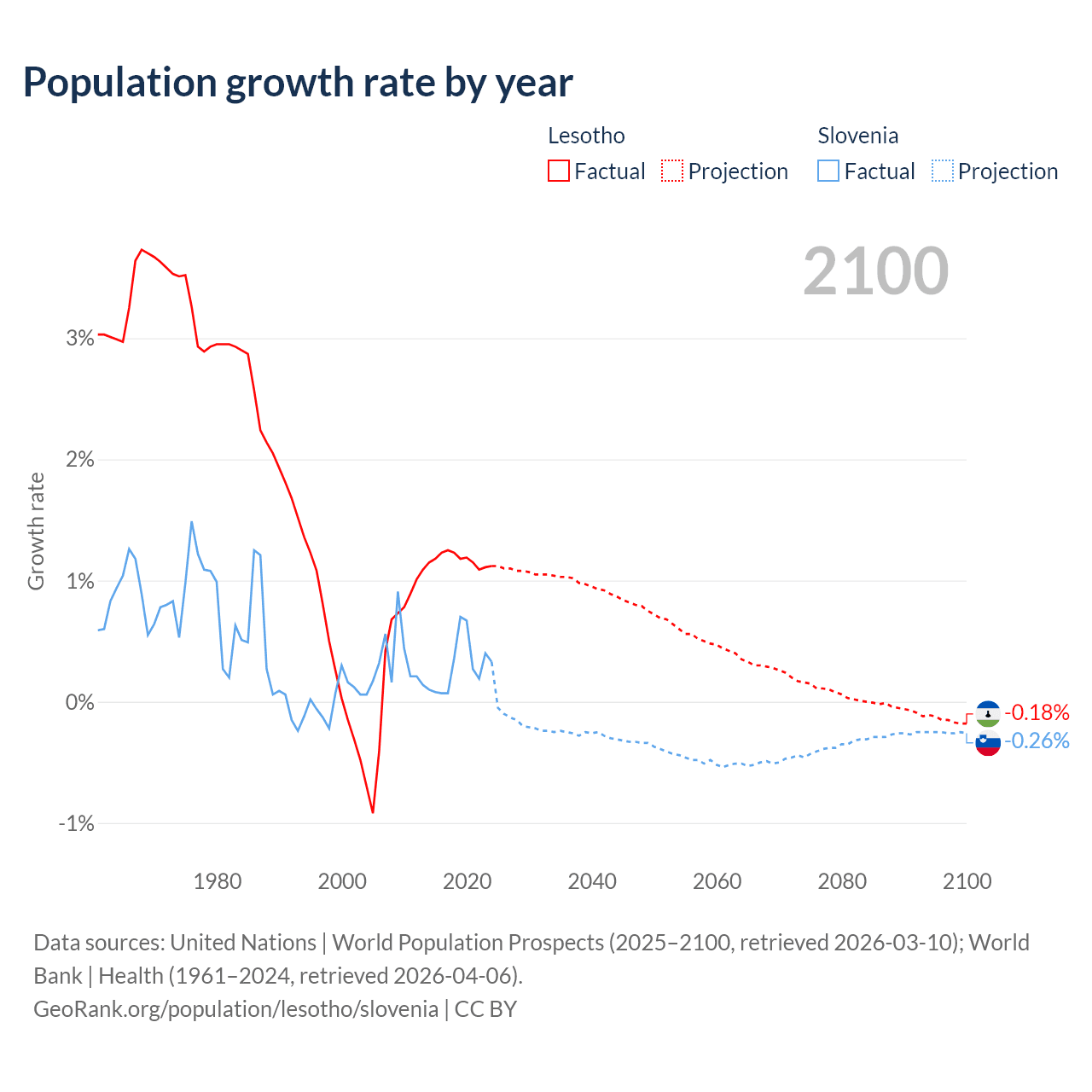 - For the last 10 years, Lesotho has had an average growth rate of +1.17% per year vs +0.29% in Slovenia.