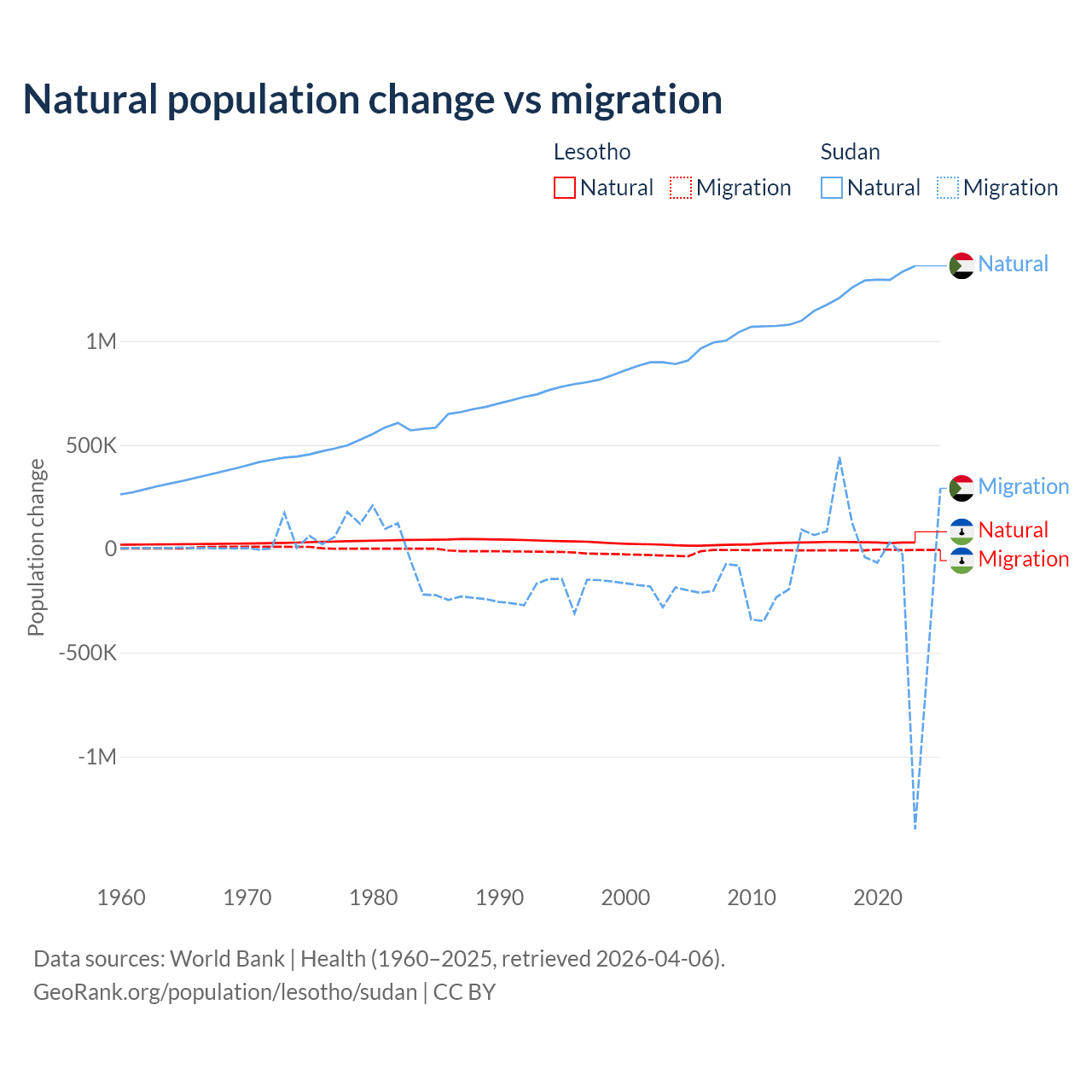 Over the last 10 years, 84.2% of the population change in Lesotho is from natural causes (a gain of 315,836 people) and 15.8% is from migration (a loss of 59,457 people). In Sudan 95.1% is from natural causes (a gain of 12,459,977 people) and 4.88% is from migration (a loss of 639,596 people).
