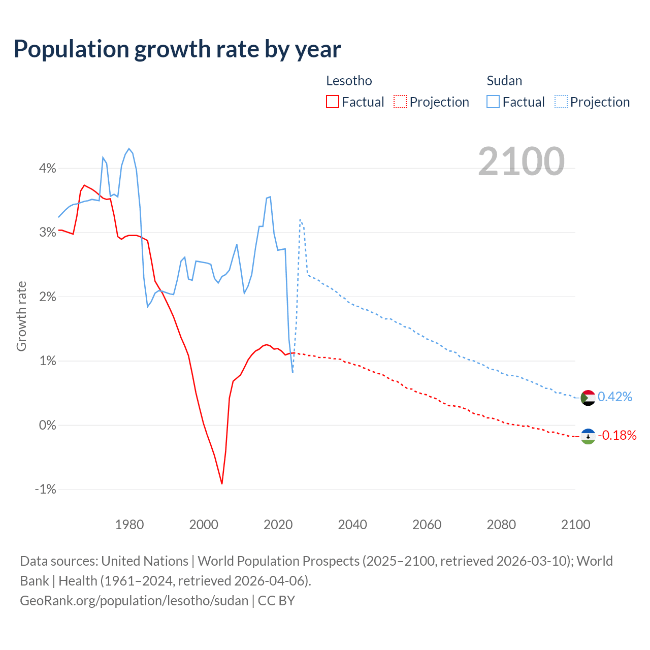 - For the last 10 years, Lesotho has had an average growth rate of +1.17% per year vs +2.67% in Sudan.
