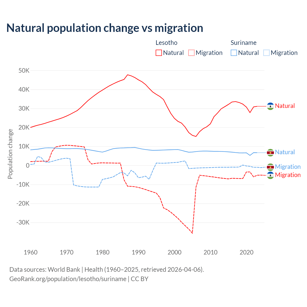 Over the last 10 years, 84.2% of the population change in Lesotho is from natural causes (a gain of 315,836 people) and 15.8% is from migration (a loss of 59,457 people). In Suriname 90.3% is from natural causes (a gain of 66,709 people) and 9.72% is from migration (a loss of 7,185 people).