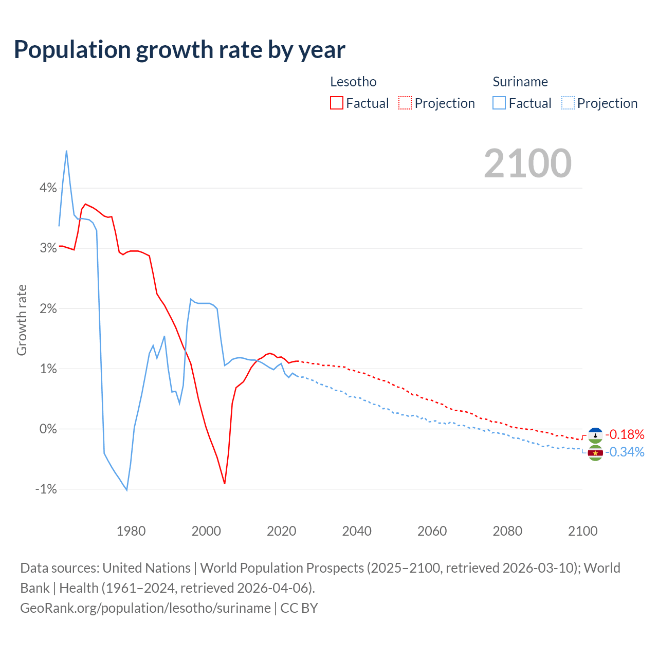 - For the last 10 years, Lesotho has had an average growth rate of +1.17% per year vs +0.99% in Suriname.