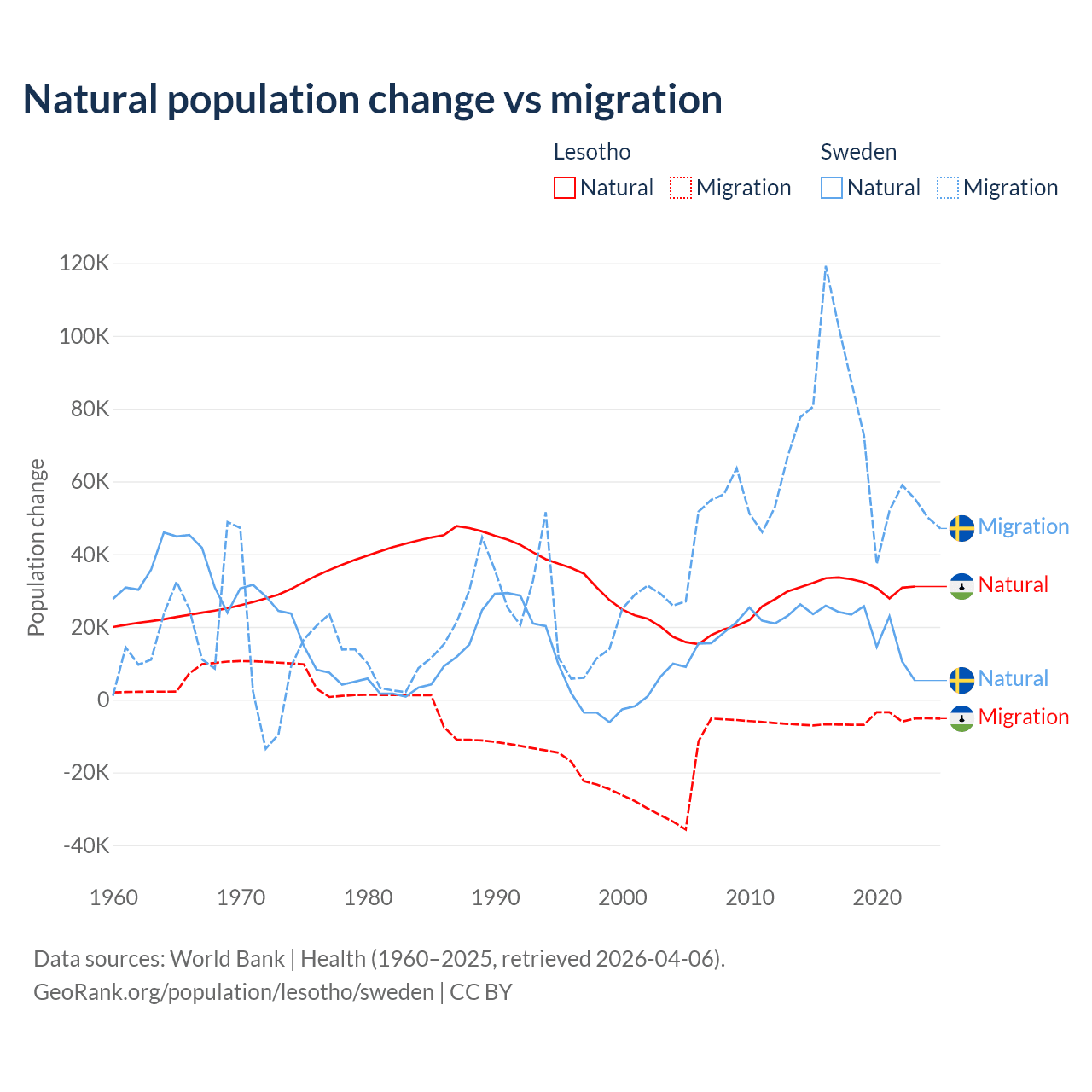 Over the last 10 years, 84.2% of the population change in Lesotho is from natural causes (a gain of 315,836 people) and 15.8% is from migration (a loss of 59,457 people). In Sweden 21.4% is from natural causes (a gain of 201,900 people) and 78.6% is from migration (a gain of 743,642 people).