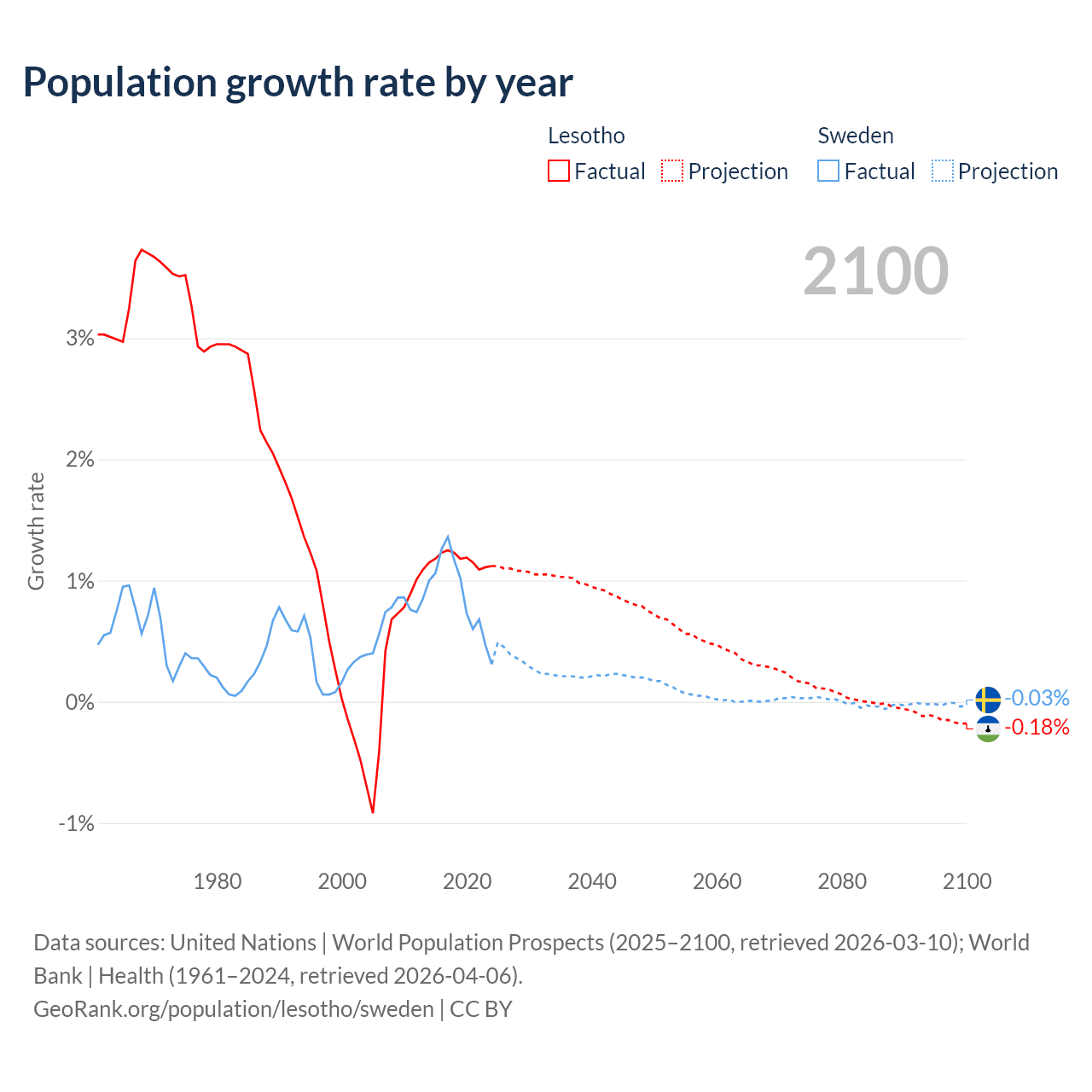 - For the last 10 years, Lesotho has had an average growth rate of +1.17% per year vs +0.88% in Sweden.