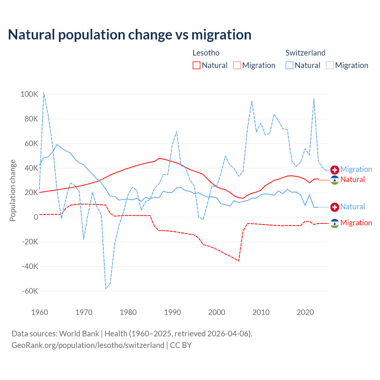 Over the last 10 years, 84.2% of the population change in Lesotho is from natural causes (a gain of 315,836 people) and 15.8% is from migration (a loss of 59,457 people). In Switzerland 21.6% is from natural causes (a gain of 165,354 people) and 78.4% is from migration (a gain of 600,145 people).
