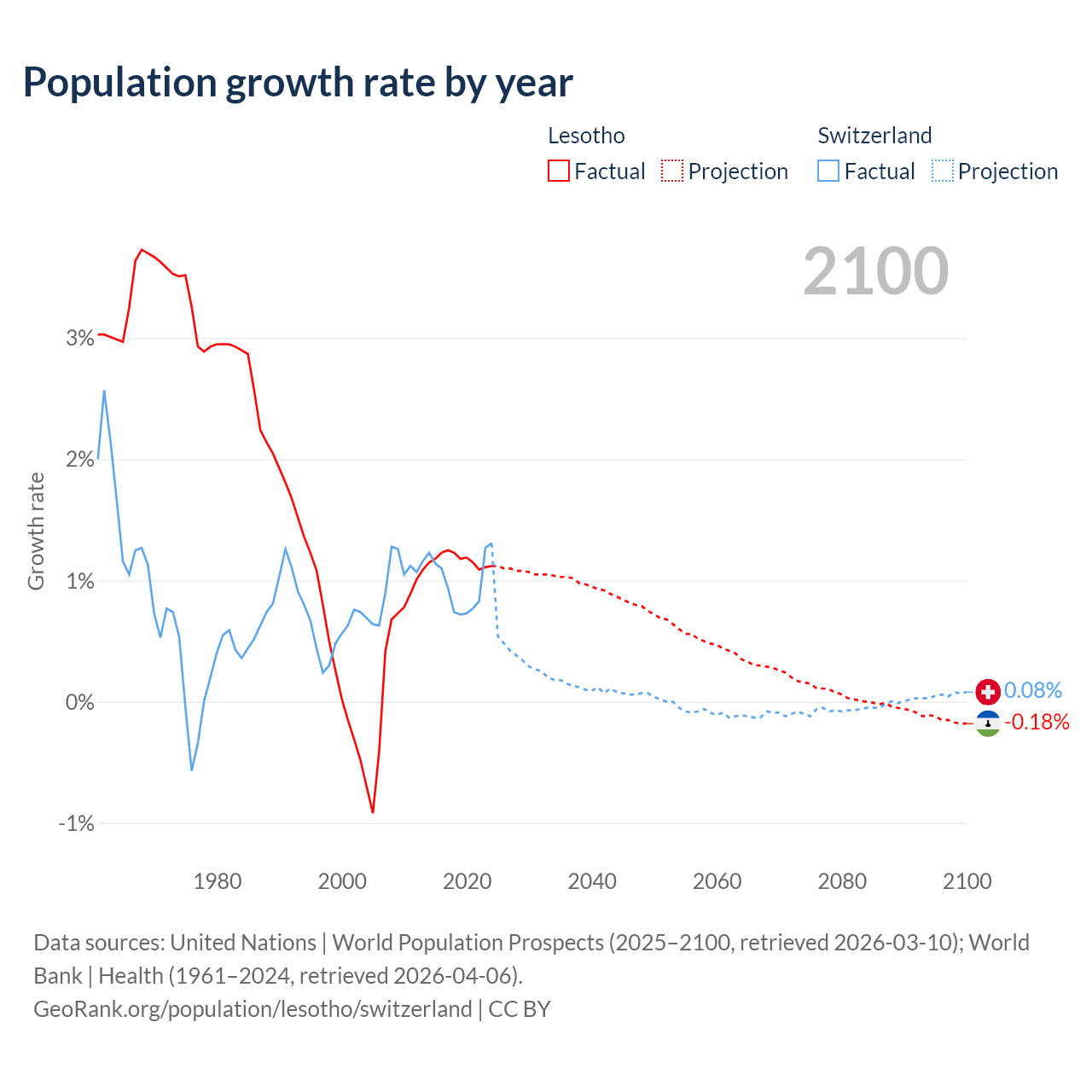 - For the last 10 years, Lesotho has had an average growth rate of +1.17% per year vs +0.98% in Switzerland.