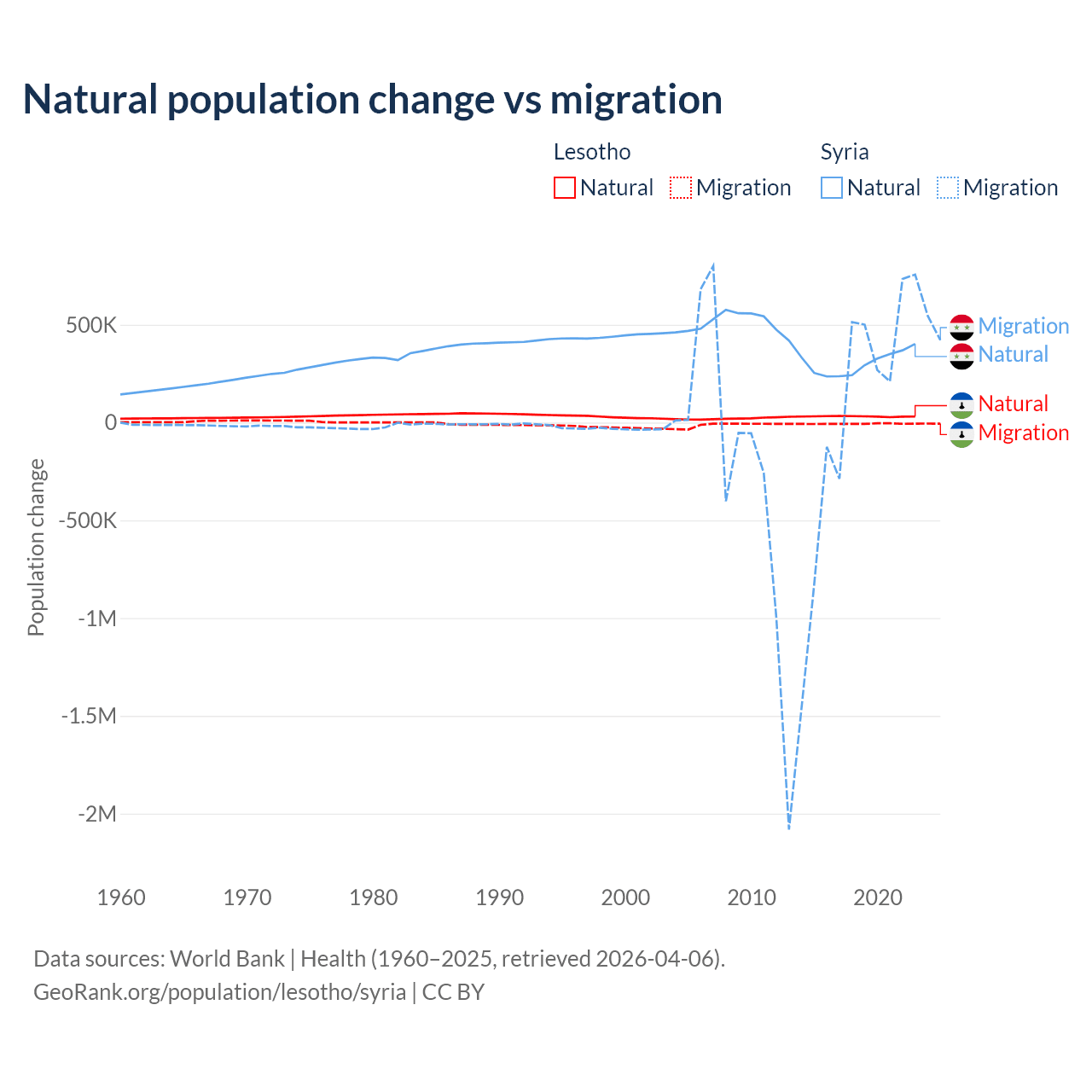 Over the last 10 years, 84.2% of the population change in Lesotho is from natural causes (a gain of 315,836 people) and 15.8% is from migration (a loss of 59,457 people). In Syria 91.3% is from natural causes (a gain of 3,047,621 people) and 8.72% is from migration (a gain of 291,069 people).