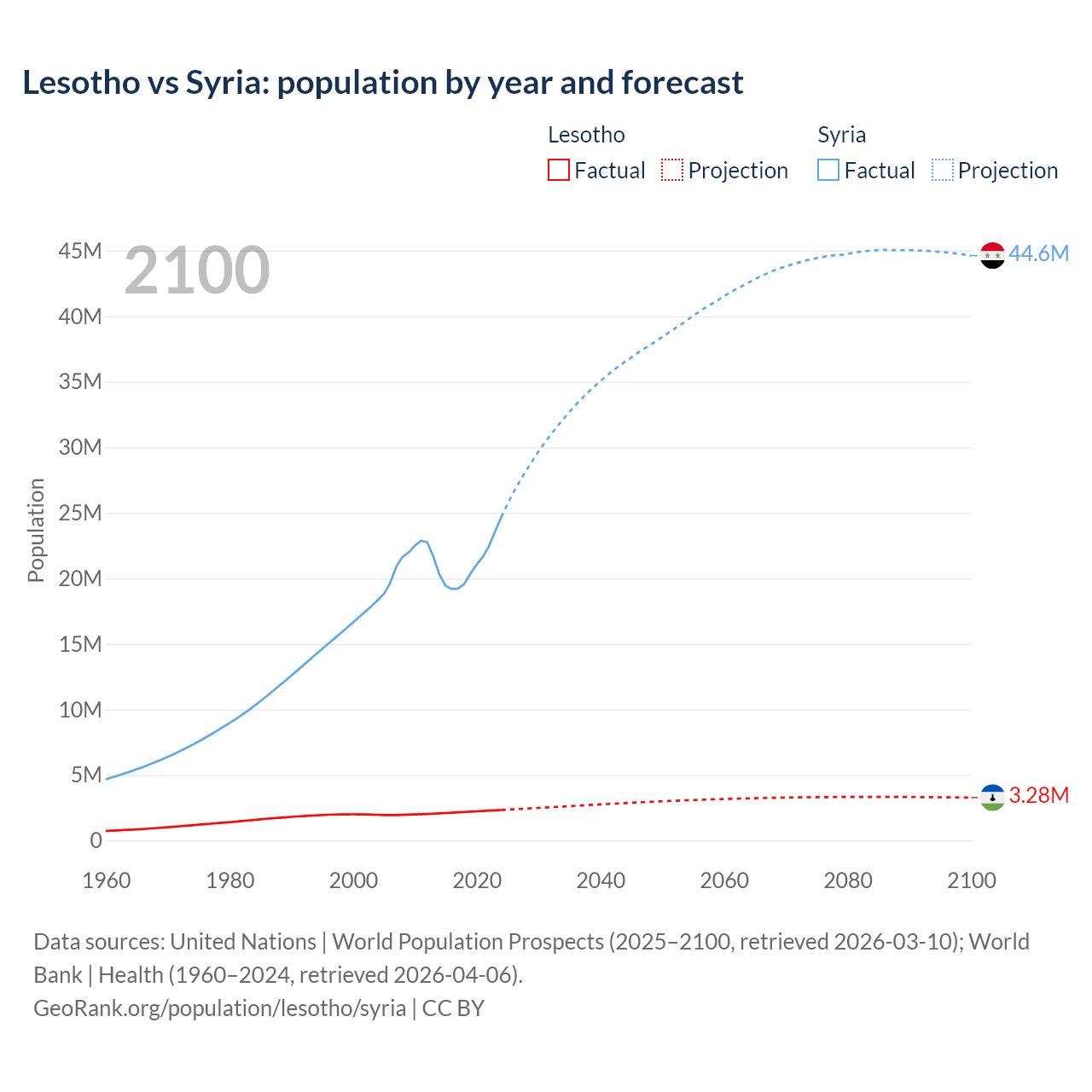 The latest officially reported population of Lesotho was 2,337,423 in 2024 vs 24,672,760 people in Syria in 2024. In 2026, based on the adjusted UN estimation, the current Lesotho's population is 2,396,633 people compared to 26,829,400 in Syria.