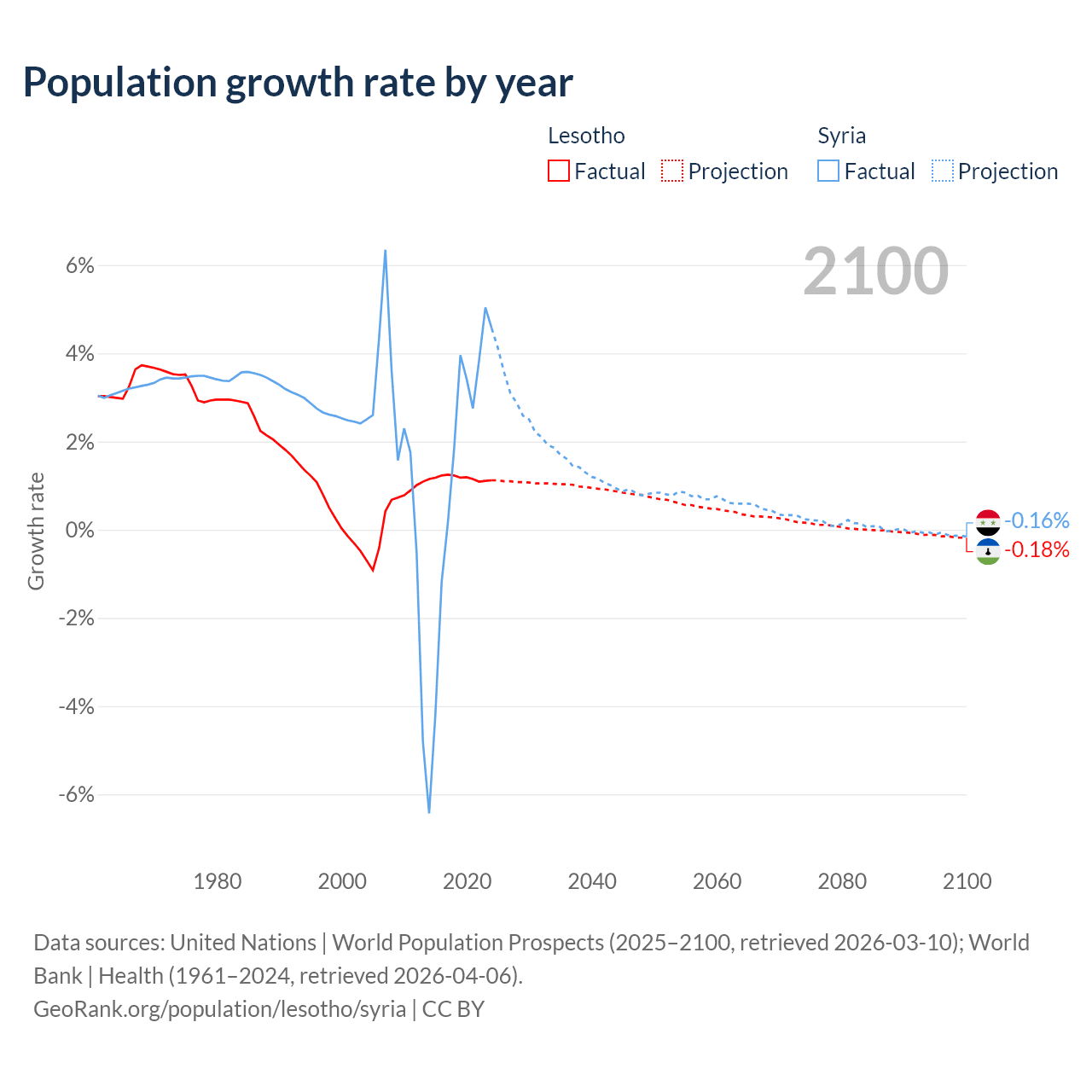- For the last 10 years, Lesotho has had an average growth rate of +1.17% per year vs +1.25% in Syria.