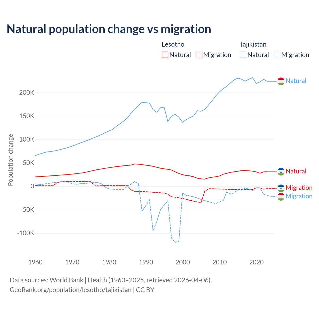 Over the last 10 years, 84.2% of the population change in Lesotho is from natural causes (a gain of 315,836 people) and 15.8% is from migration (a loss of 59,457 people). In Tajikistan 96% is from natural causes (a gain of 2,266,045 people) and 3.95% is from migration (a loss of 93,205 people).