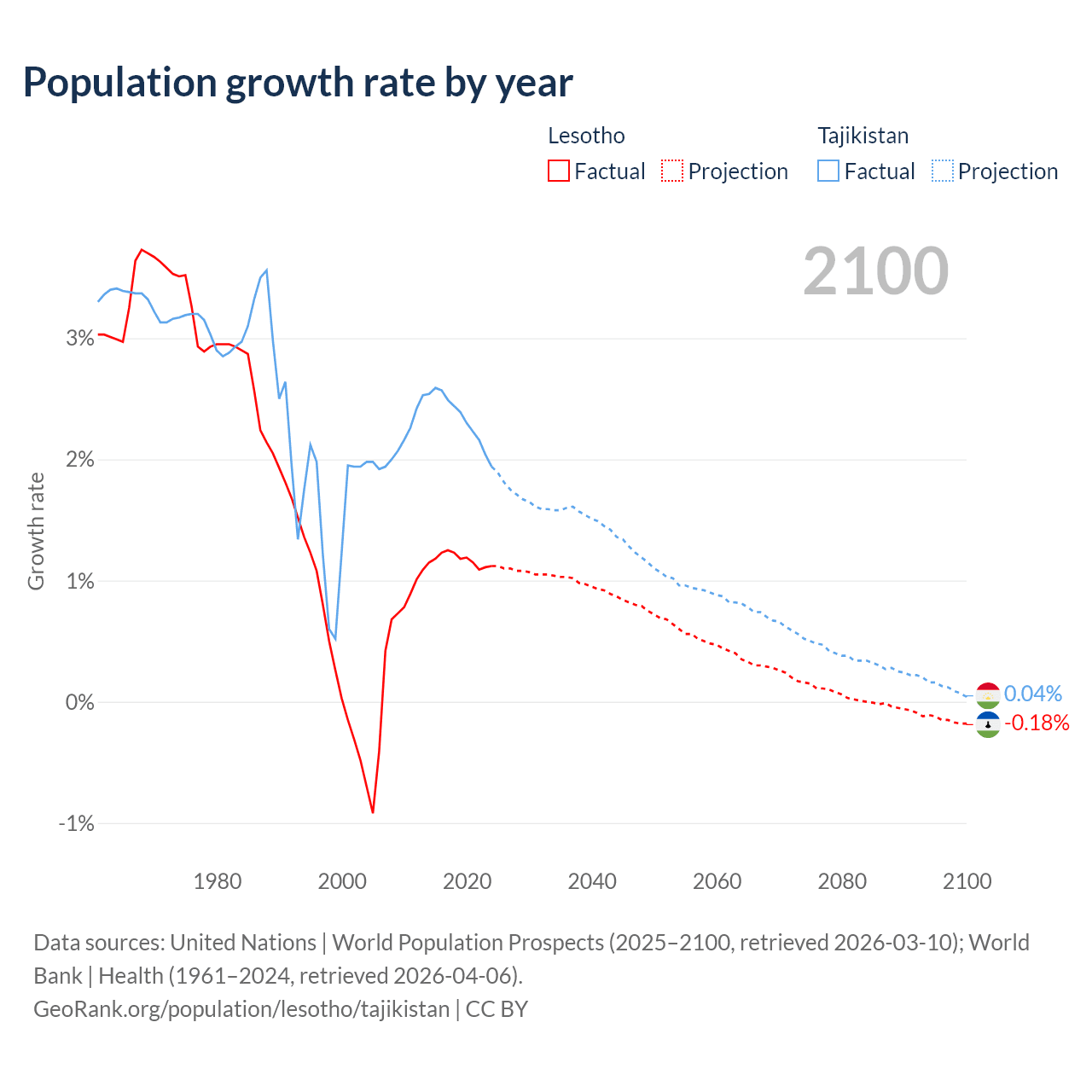 - For the last 10 years, Lesotho has had an average growth rate of +1.17% per year vs +2.33% in Tajikistan.