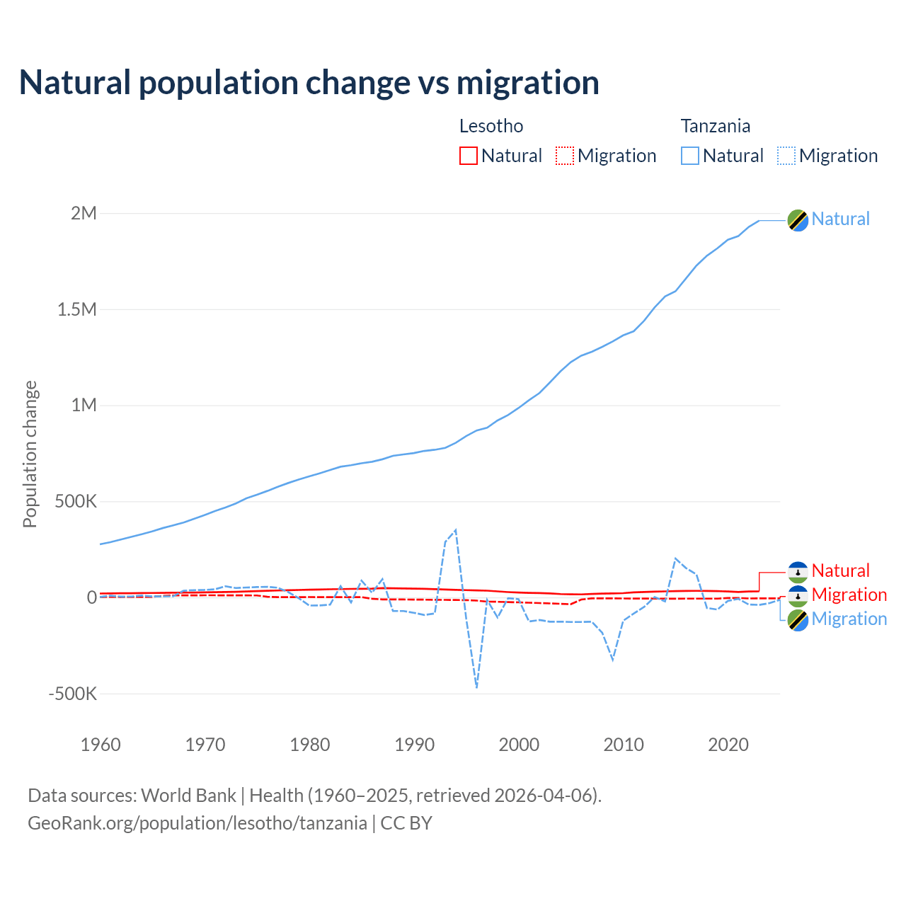 Over the last 10 years, 84.2% of the population change in Lesotho is from natural causes (a gain of 315,836 people) and 15.8% is from migration (a loss of 59,457 people). In Tanzania 98.7% is from natural causes (a gain of 17,769,541 people) and 1.27% is from migration (a gain of 229,466 people).