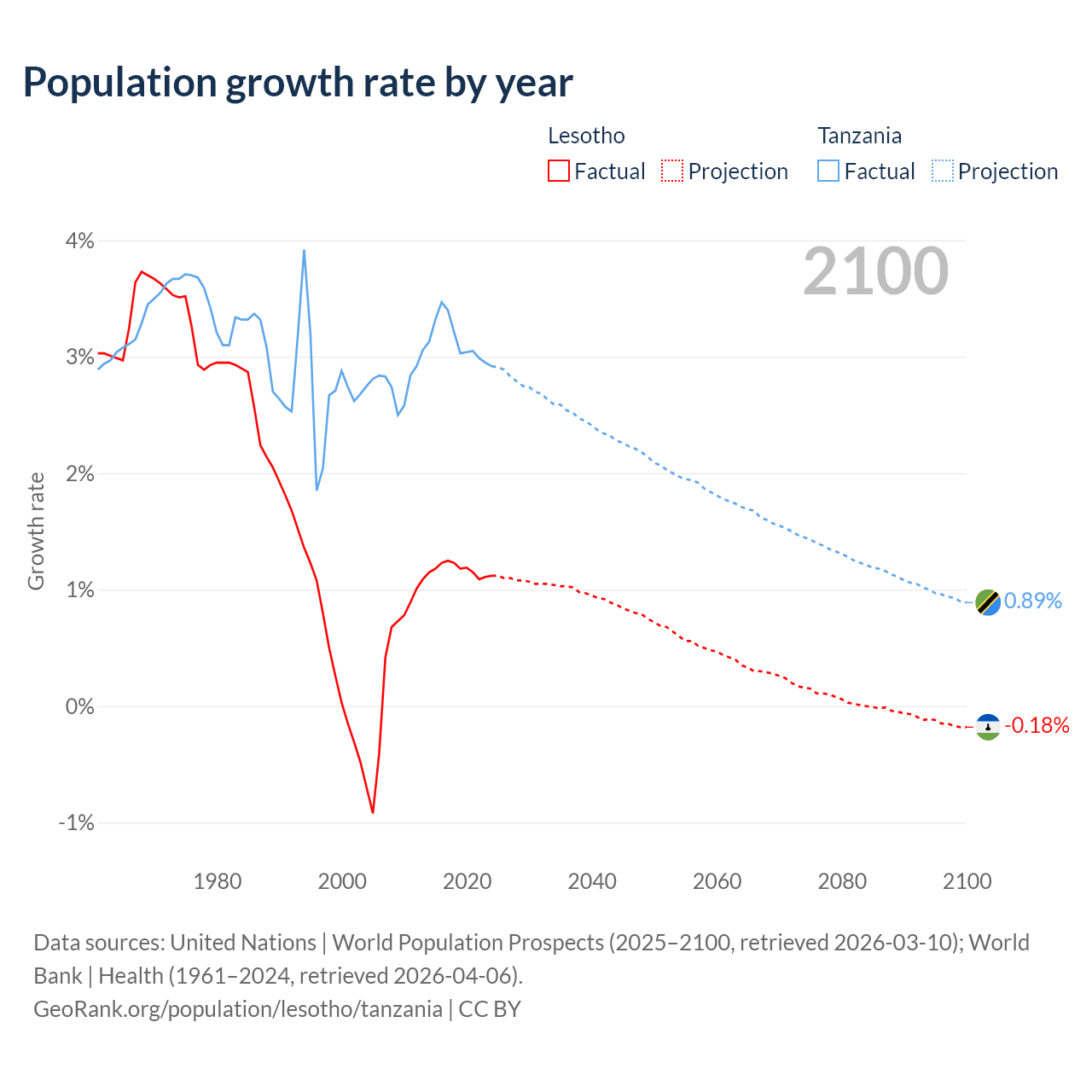 - For the last 10 years, Lesotho has had an average growth rate of +1.17% per year vs +3.13% in Tanzania.