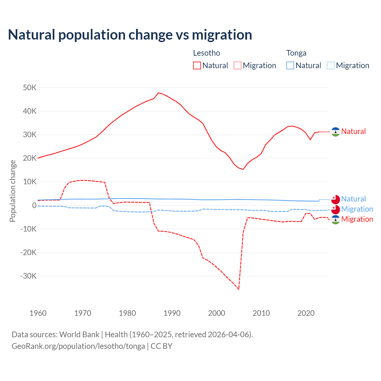 Over the last 10 years, 84.2% of the population change in Lesotho is from natural causes (a gain of 315,836 people) and 15.8% is from migration (a loss of 59,457 people). In Tonga 46.9% is from natural causes (a gain of 18,919 people) and 53.1% is from migration (a loss of 21,384 people).