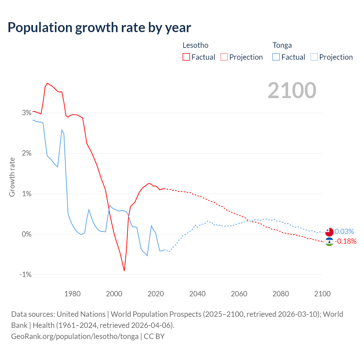 - For the last 10 years, Lesotho has had an average growth rate of +1.17% per year vs -0.25% in Tonga.
