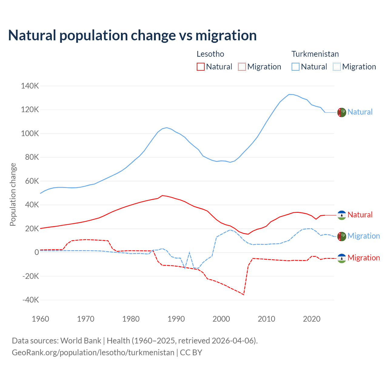 Over the last 10 years, 84.2% of the population change in Lesotho is from natural causes (a gain of 315,836 people) and 15.8% is from migration (a loss of 59,457 people). In Turkmenistan 89.2% is from natural causes (a gain of 1,270,228 people) and 10.8% is from migration (a gain of 154,379 people).