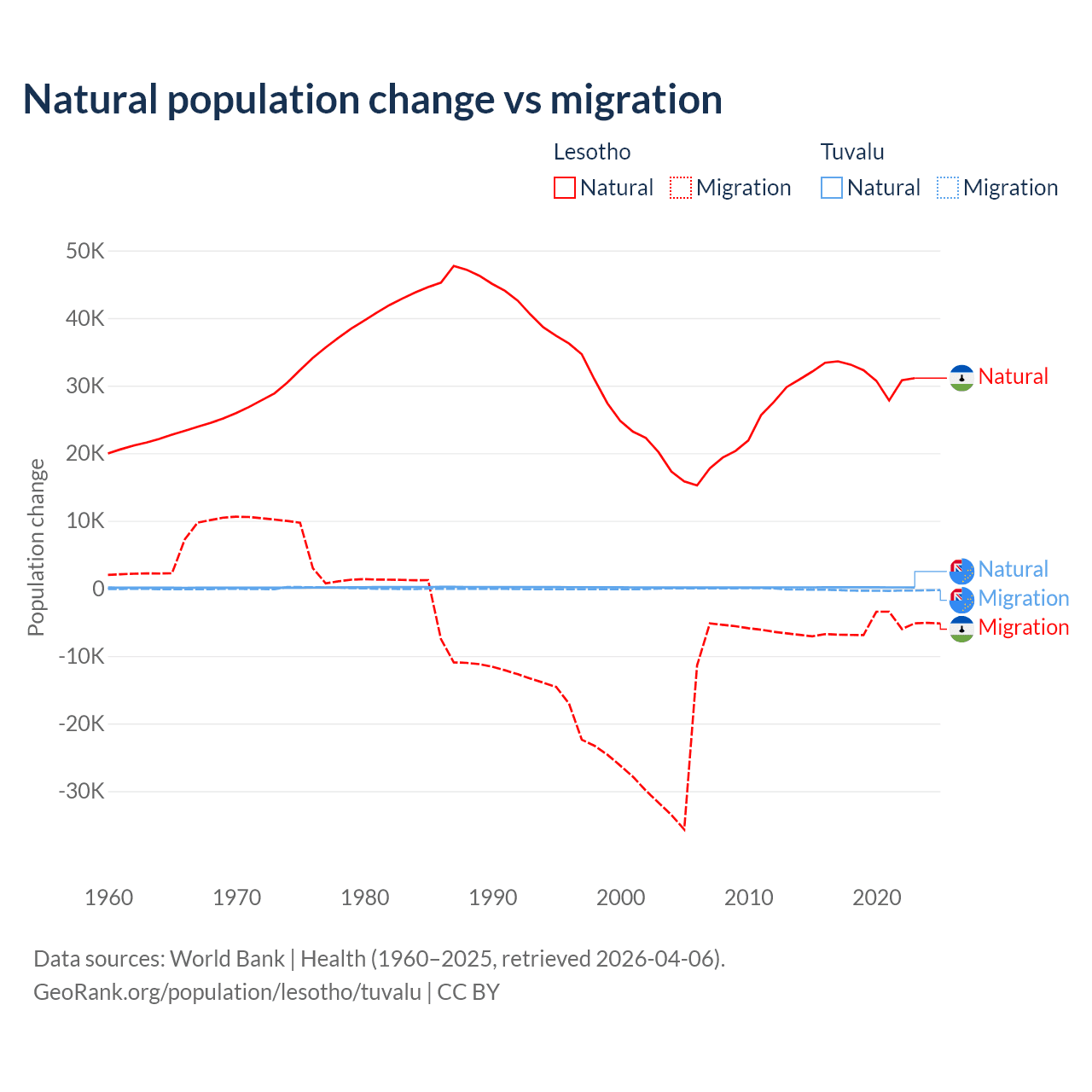 Over the last 10 years, 84.2% of the population change in Lesotho is from natural causes (a gain of 315,836 people) and 15.8% is from migration (a loss of 59,457 people). In Tuvalu 35.5% is from natural causes (a gain of 1,556 people) and 64.5% is from migration (a loss of 2,827 people).