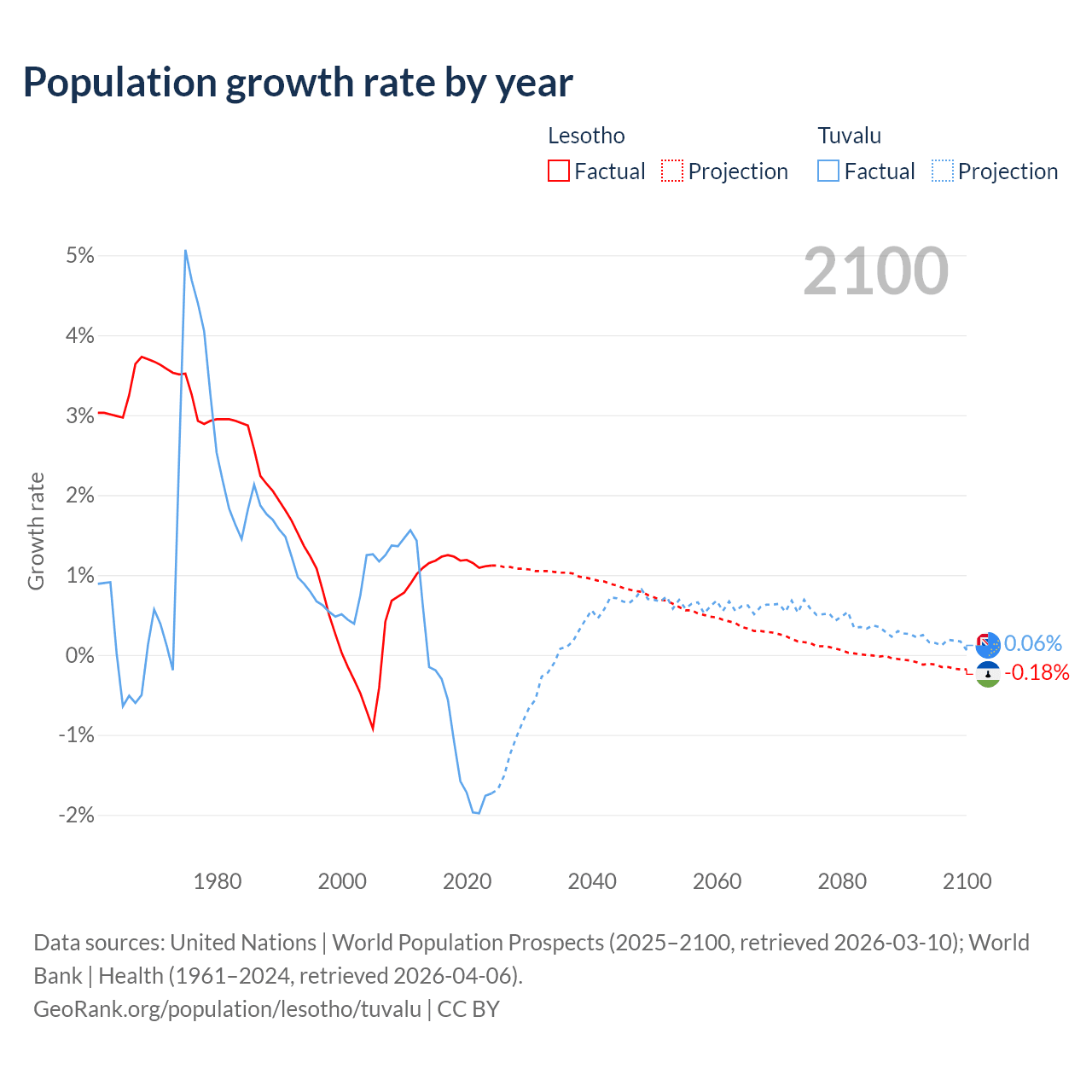 - For the last 10 years, Lesotho has had an average growth rate of +1.17% per year vs -1.19% in Tuvalu.