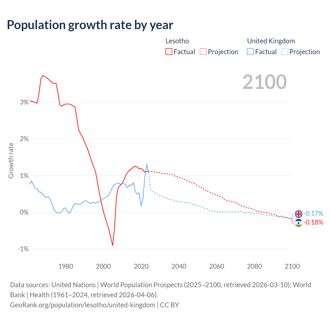 - For the last 10 years, Lesotho has had an average growth rate of +1.17% per year vs +0.7% in the United Kingdom.