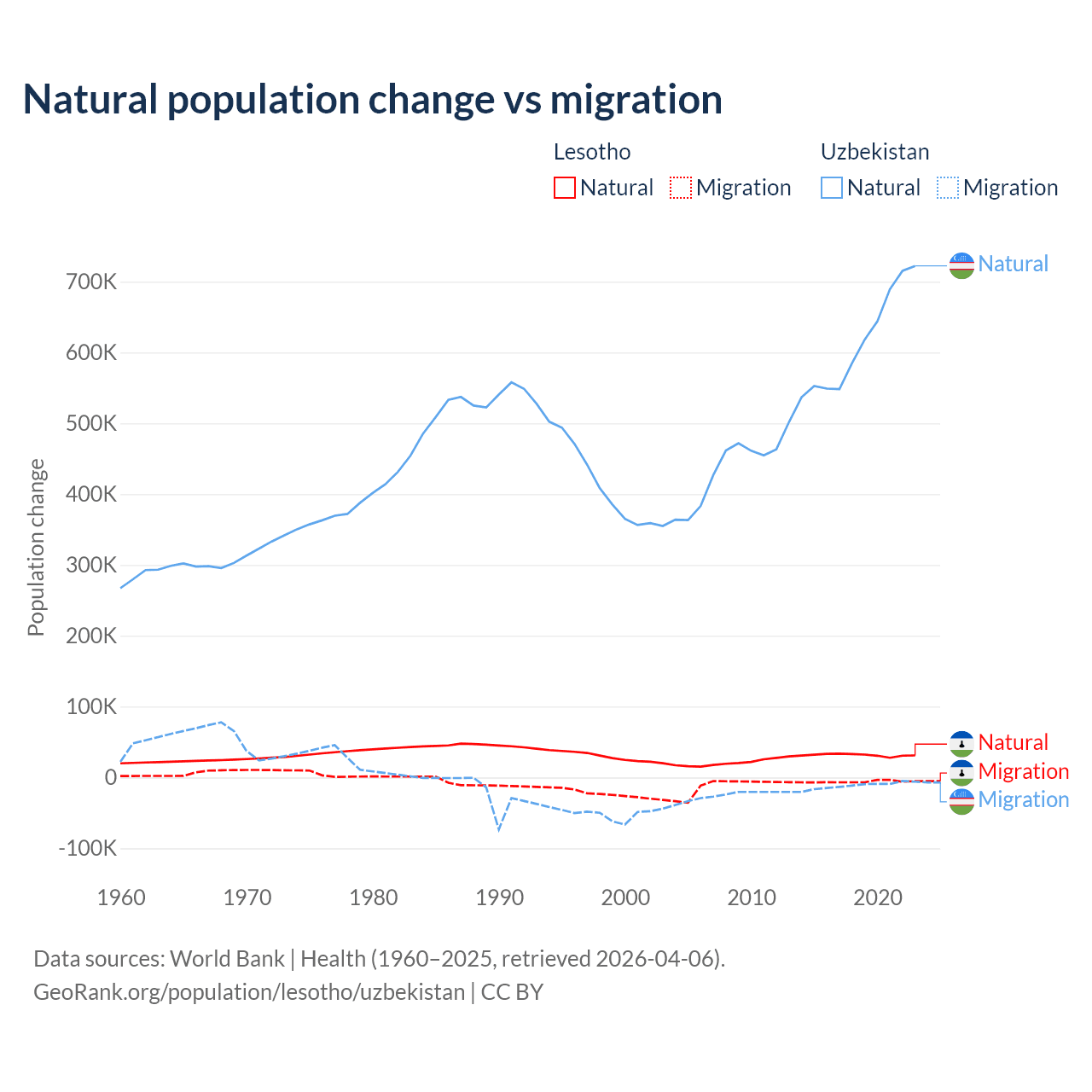 Over the last 10 years, 84.2% of the population change in Lesotho is from natural causes (a gain of 315,836 people) and 15.8% is from migration (a loss of 59,457 people). In Uzbekistan 98.2% is from natural causes (a gain of 6,161,117 people) and 1.84% is from migration (a loss of 115,398 people).