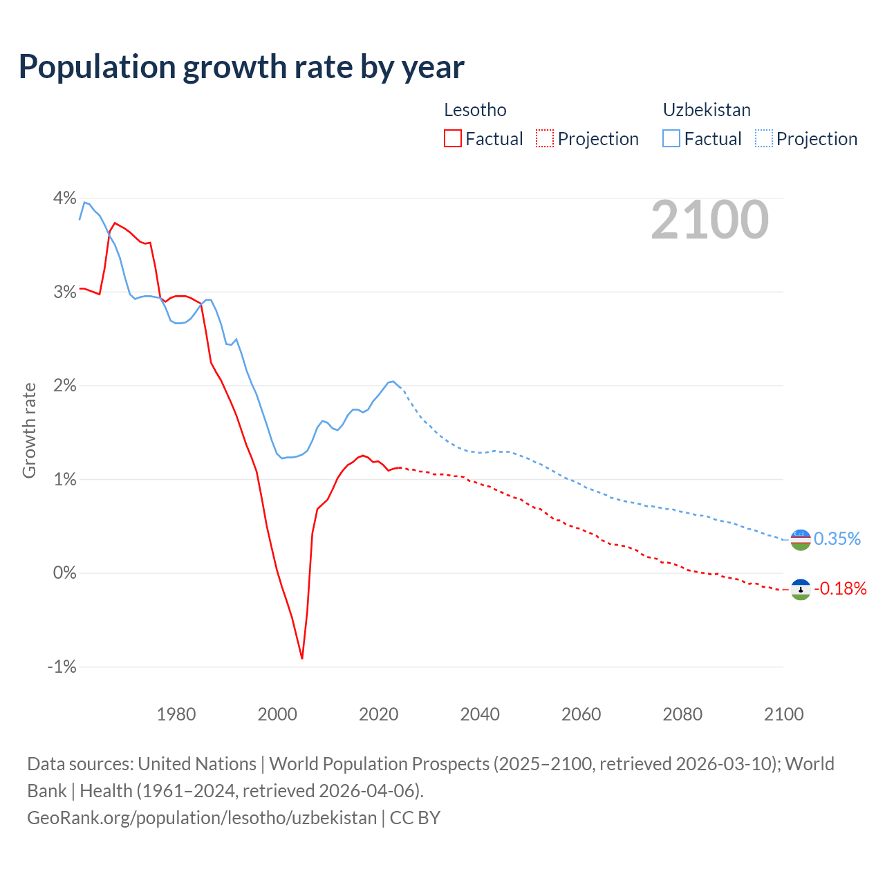 - For the last 10 years, Lesotho has had an average growth rate of +1.17% per year vs +1.85% in Uzbekistan.