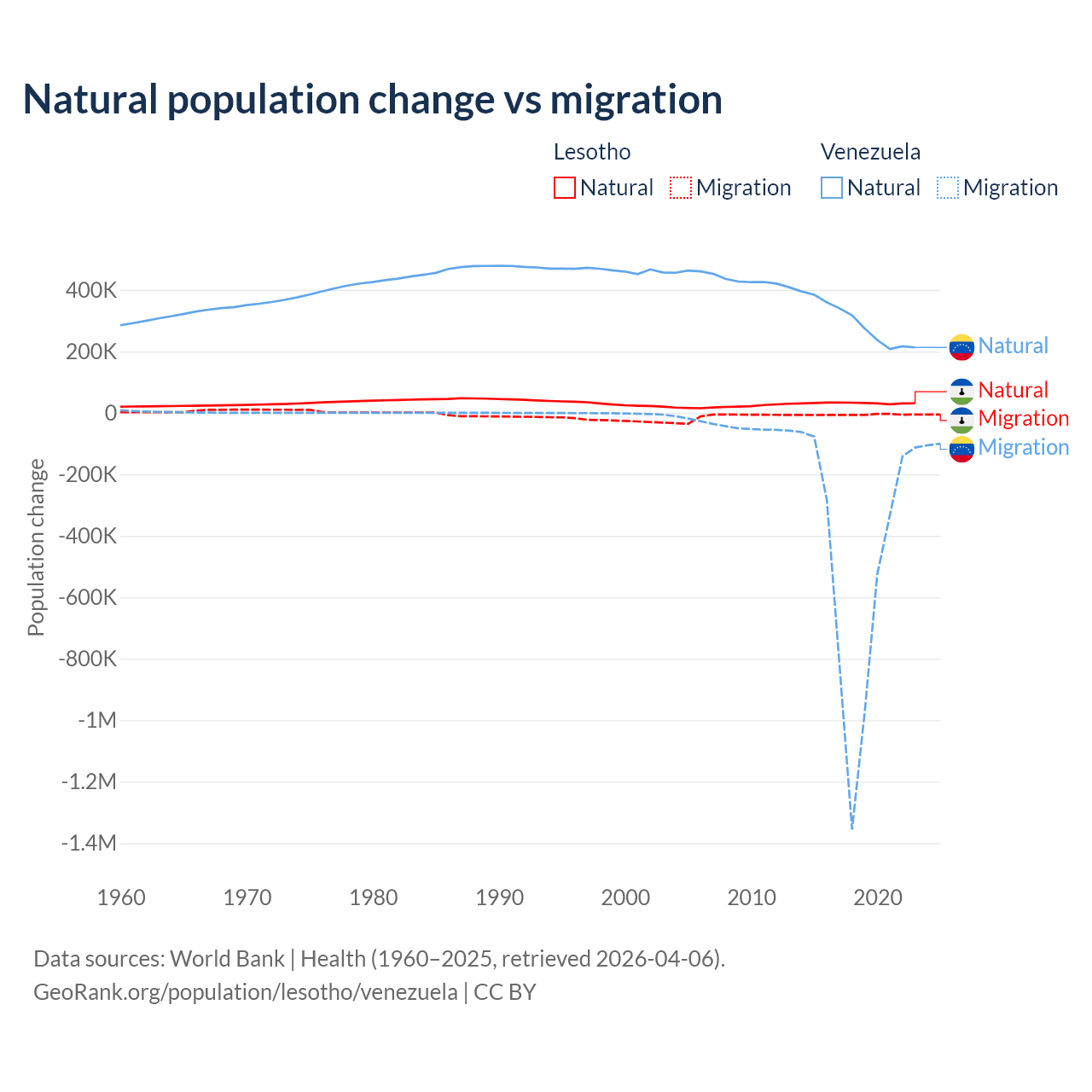 Over the last 10 years, 84.2% of the population change in Lesotho is from natural causes (a gain of 315,836 people) and 15.8% is from migration (a loss of 59,457 people). In Venezuela 38.6% is from natural causes (a gain of 2,946,257 people) and 61.4% is from migration (a loss of 4,683,227 people).